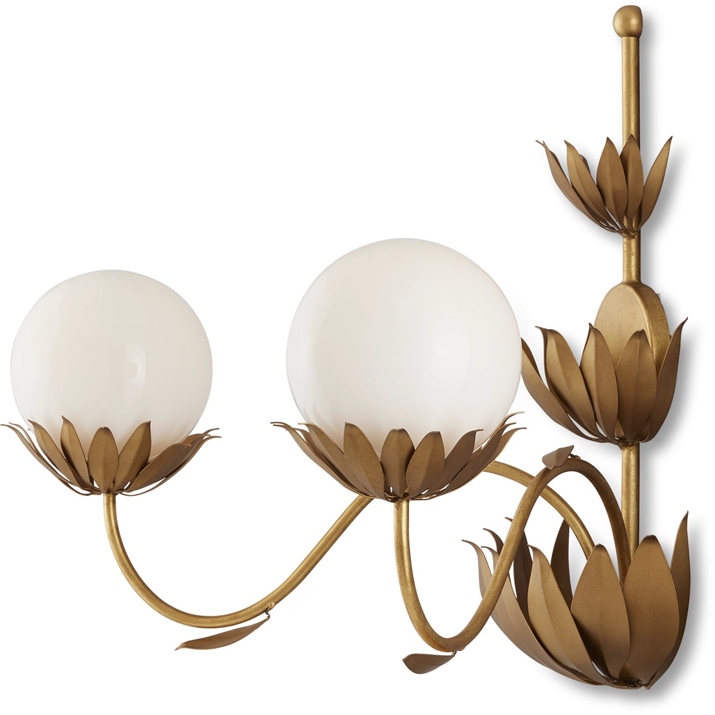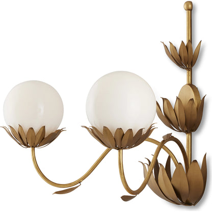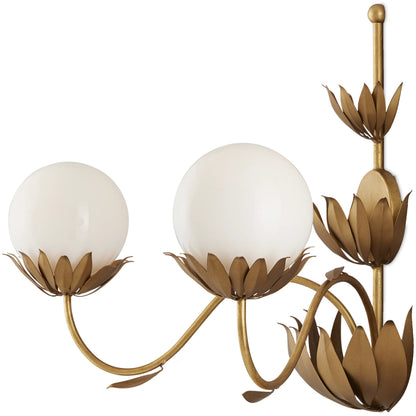 When he designed the Mirasole Gold Wall Sconce, Tom Caldwell was feeling nostalgic, remembering the décor of ice cream parlors that were staples at one time in America. The milky glass globes are supported on shapely stems in a contemporary gold leaf finish and ornamented with fluted leaf patterns in a darker gold finish to add interest to the design. Whimsical details are the single leaves fluttering from the stems.