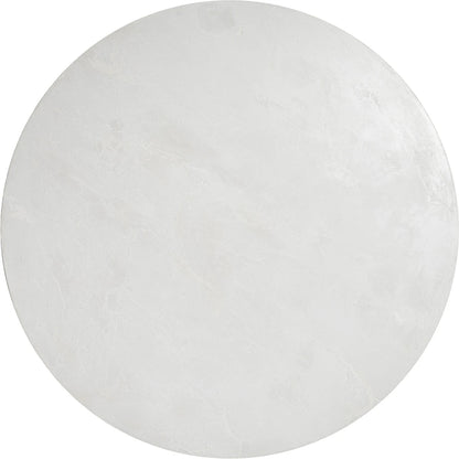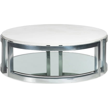 A large round scagliola white top sits on a modern polished nickel frame, with a mirror shelf to complete the base.
