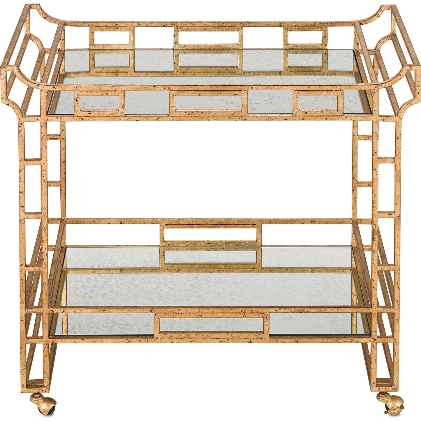 Reminiscient of the distinctive pagodas so common to Asian architecture, the Odeon Bar Cart embraces the chinoiserie trend. Skillful wrought iron fretwork is accentuated by a Seneca Gold Leaf finish, while Light Roche Antique Mirror surfaces finish off the look of this outstanding accent piece.