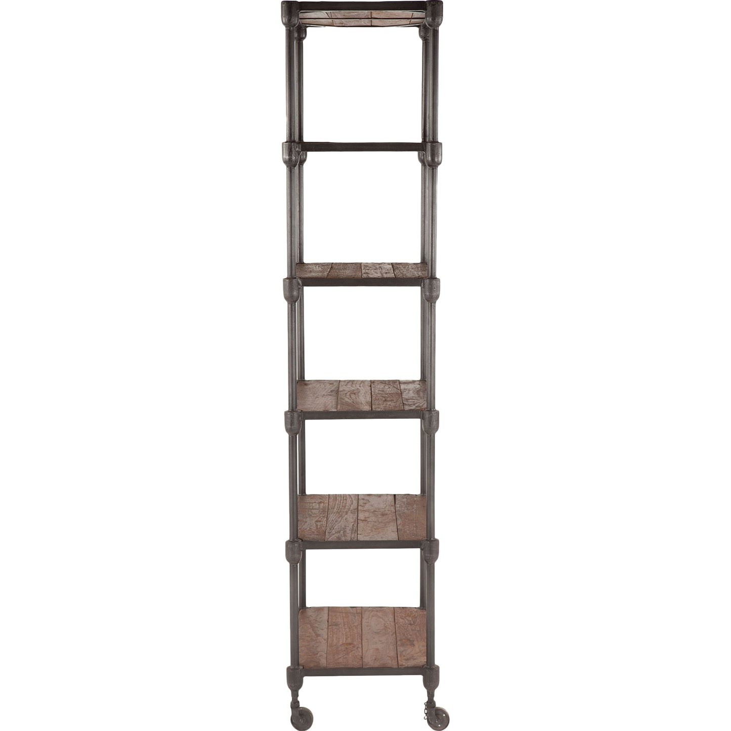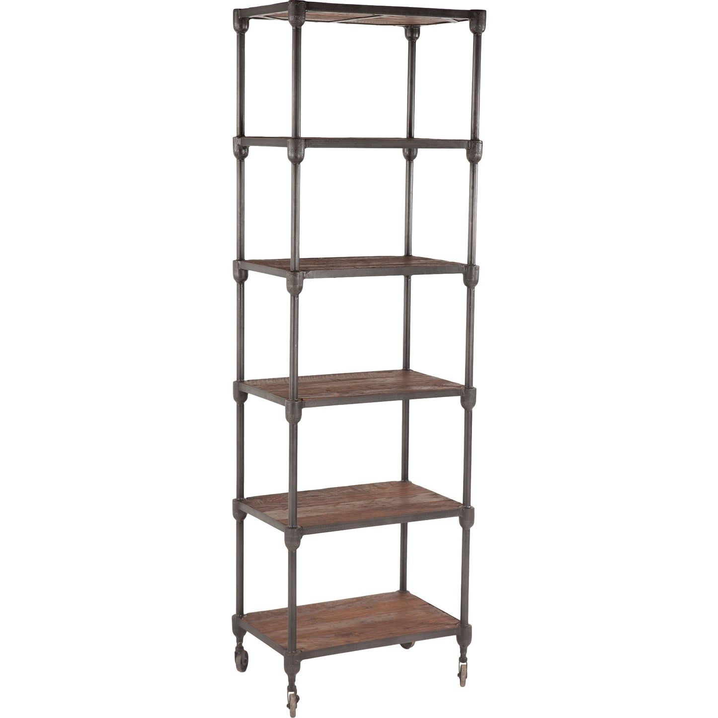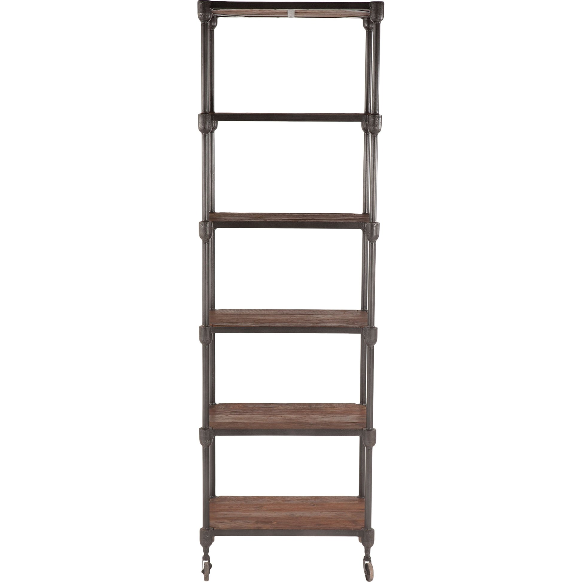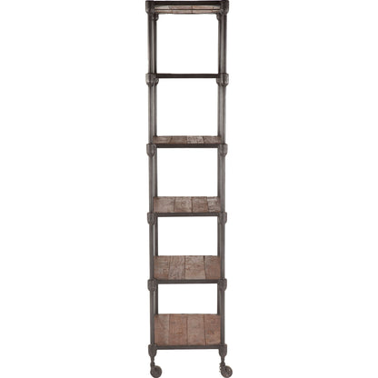 Reclaimed teak wood and a mixture of hand-forged and cast iron fuse together to create an eclectic assortment of accent pieces in the Paxton collection. Crafted exclusively from reclaimed materials, each piece in this collection is visually stunning and is sure to make a lasting impact in your home while simultaneously preserving valuable natural resources. Whether you're looking to bring harmony to a cluttered office or create a display of your favorite novels and framed photos in the den, this understated bookcase offers up a touch of industrial appeal to your decor. Standing at over 80-inches tall, this bookcase includes five shelves that offer versatility in display options. Set this bookshelf against an off-white or gray wall to compliment the gray zinc finish of the cast iron frame and the weathered walnut finish of the shelves, and let the wall show through the openwork design.