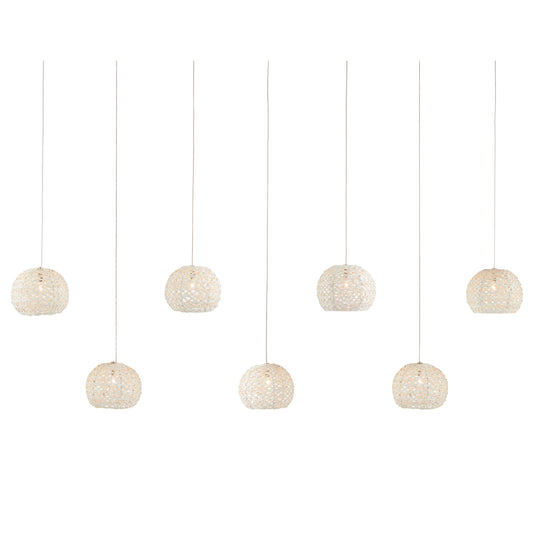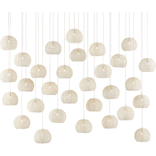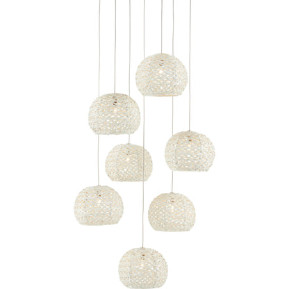 The shades on the Piero 7-Light Multi-Drop Pendant may appear to be woven from a natural plant material, but they are made of iron in a white finish to make it one of our offerings that illustrates the skills our craftspeople bring to their work. When the white pendant is illuminated, textural patterns will enliven surrounding surfaces. We also offer this design in chandeliers in several sizes.