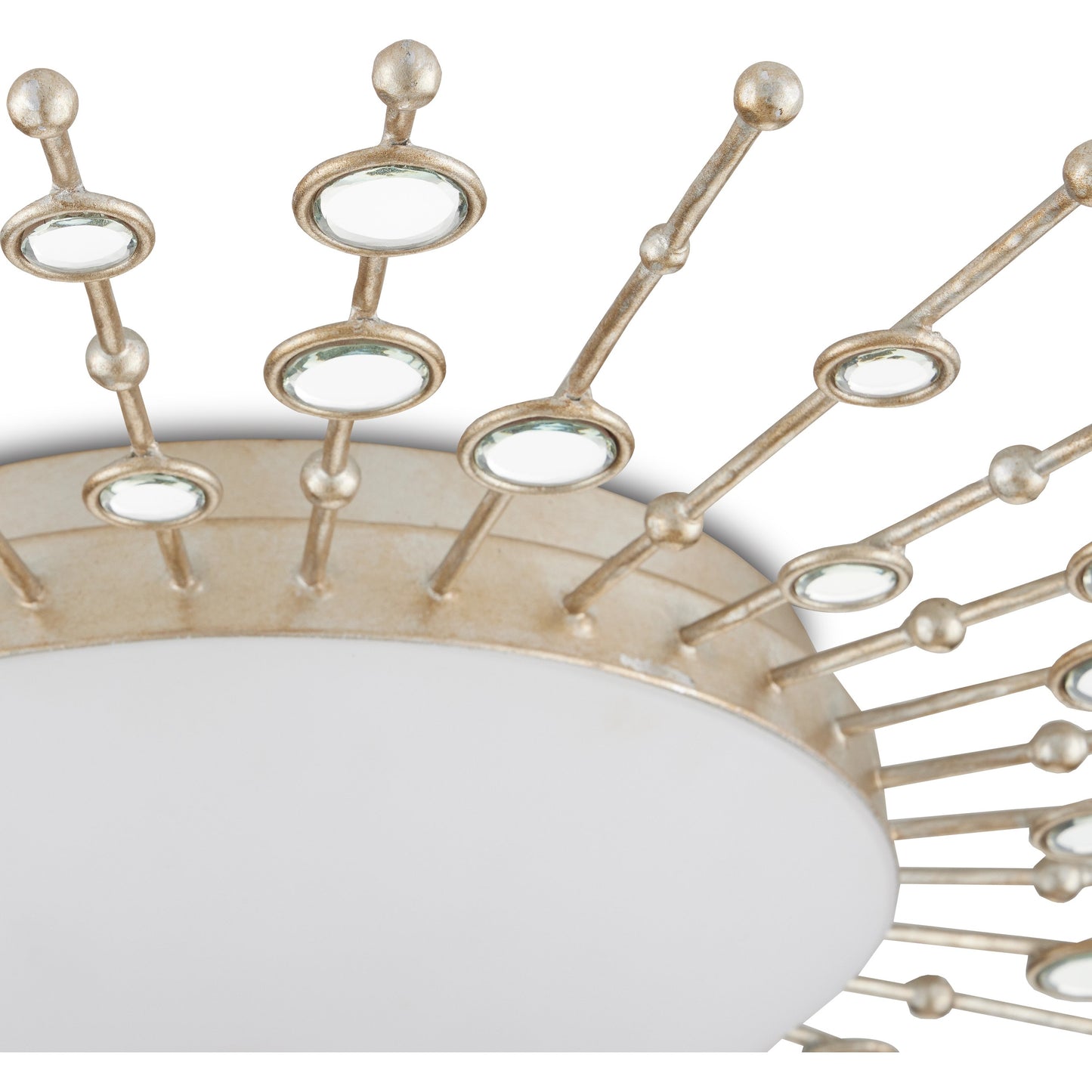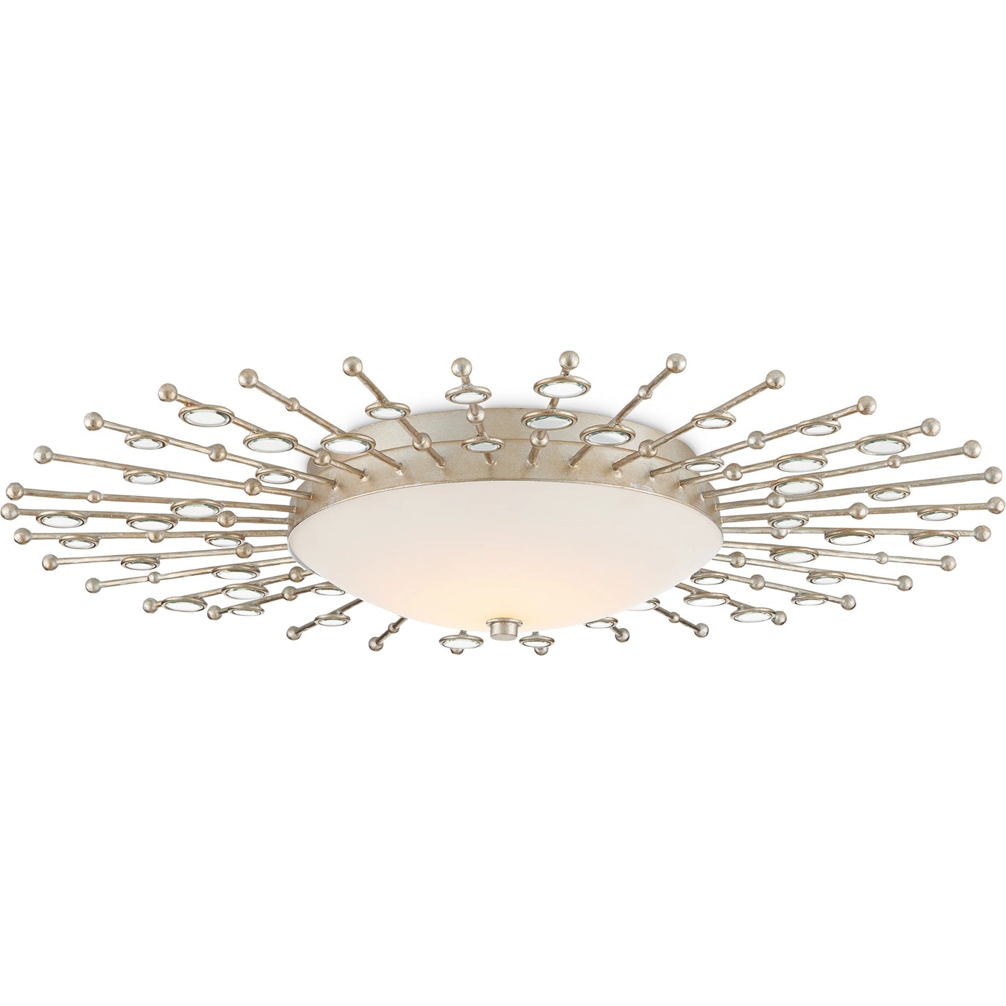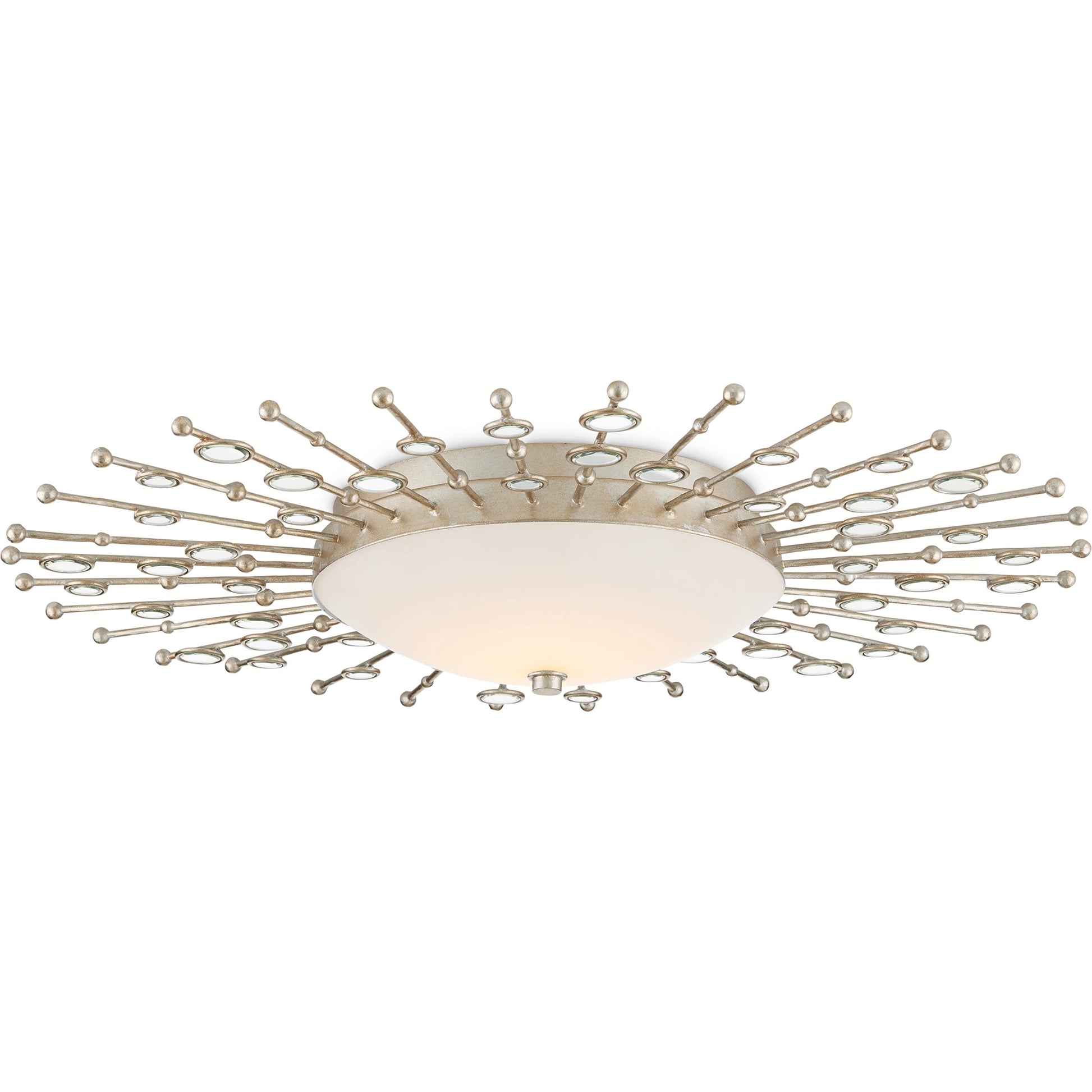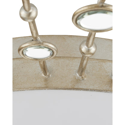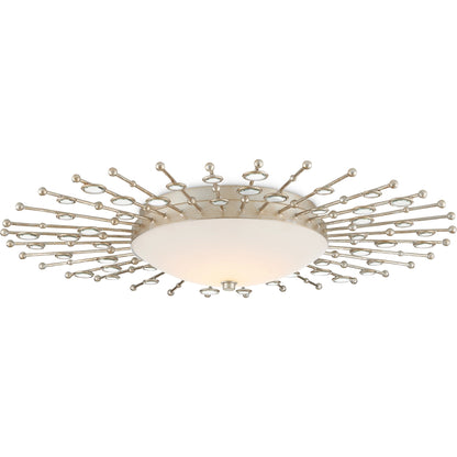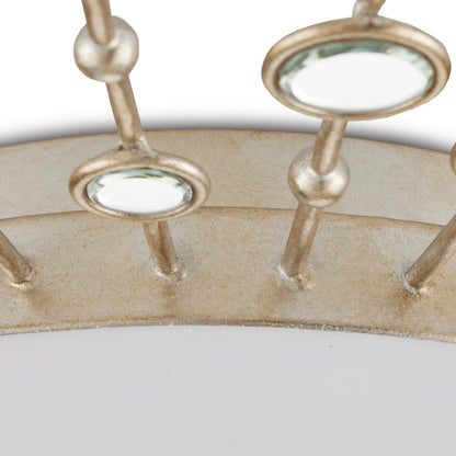 The heavenly profile of the Planisphere Flush Mount, which has a very low profile at a mere four inches from the ceiling, was envisioned by Ian Thornton. He was inspired by mid-century modern wall décor, though he brought a contemporary feel to the classic style. The beveled circlets, which are made of frosted glass, fit seamlessly into the spokes in a silver leaf finish. This silver ceiling light glows with integrated LED technology.