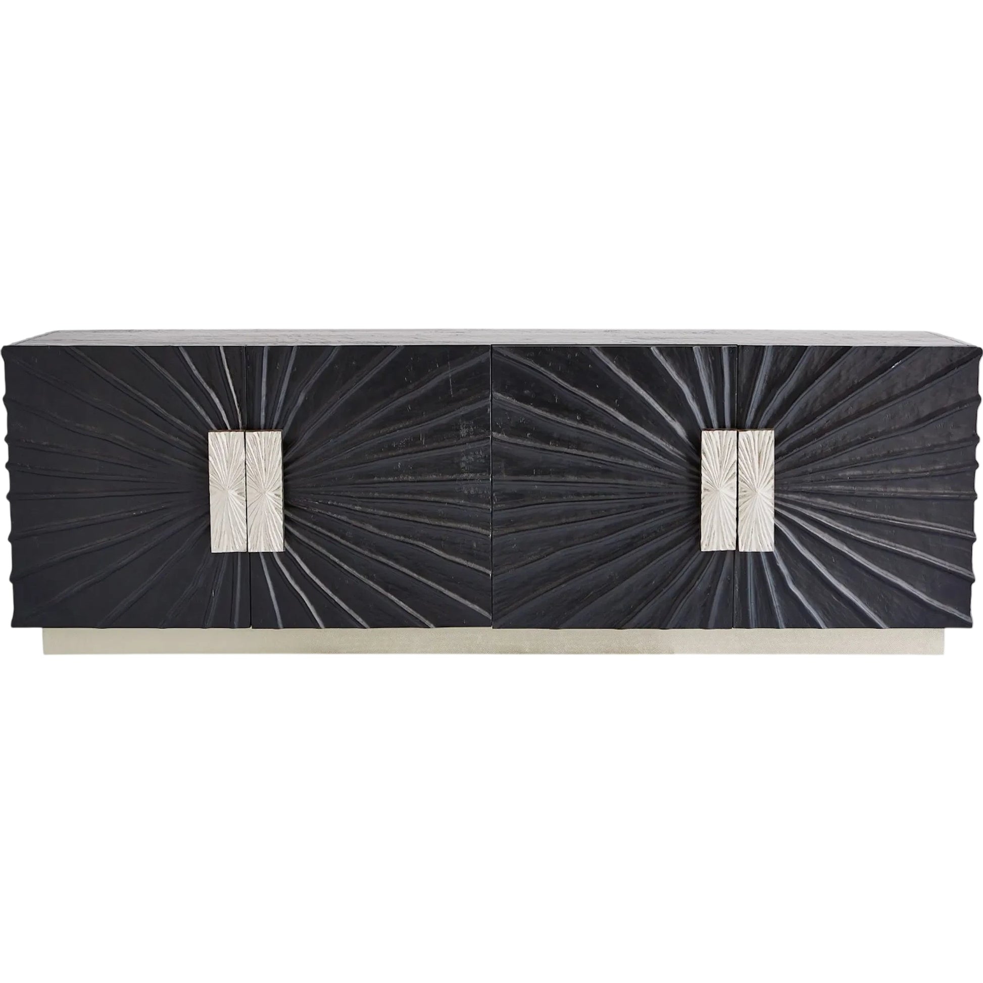Pleated Media cabinet is vintage inspired. Textured pine wood in a black onyx finish with cast aluminum, door pulls. Equipment cooling slat back and adjustable shelves with a metal clad base.