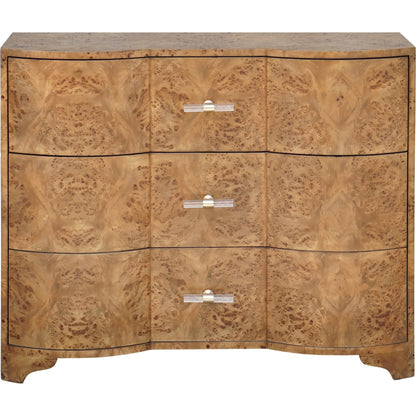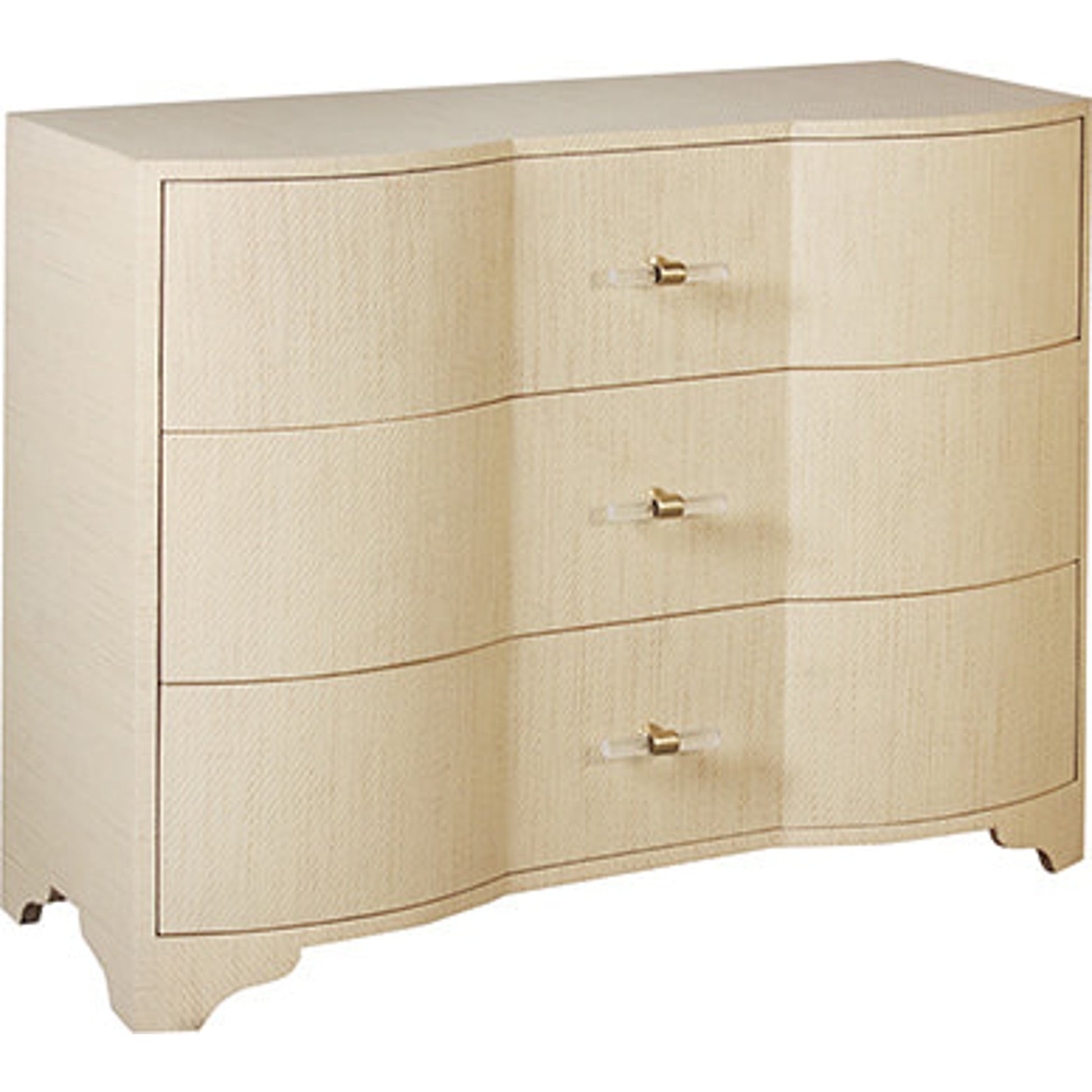 Our stunning Plymouth three drawer chest is a modern heirloom in the making! Distinctive, serpentine profile is dressed in exquisite, grey grasscloth and accented with acrylic cylinder & brass hardware. Three generously scaled drawers make Plymouth an elegant storage solution for any interior.