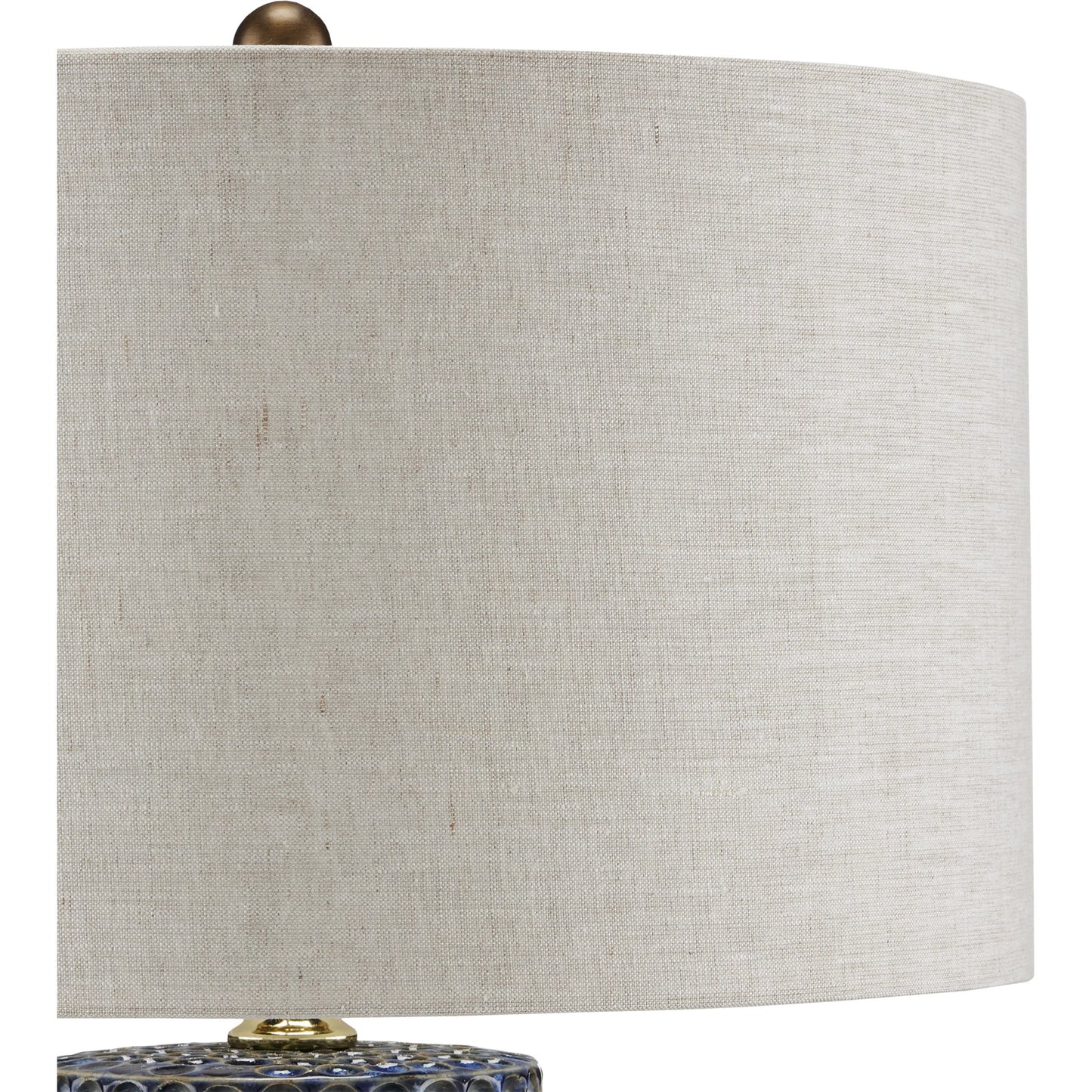 The Polka Dot Blue Table Lamp has a columnar ceramic body with a flowing pattern of circular shapes pressed into it, creating drifts of polka dots. Covered in a reactive glaze, the navy blue table lamp has added depth and texture when a brighter blue color shows through. A metal finial holds the natural linen shade in place.