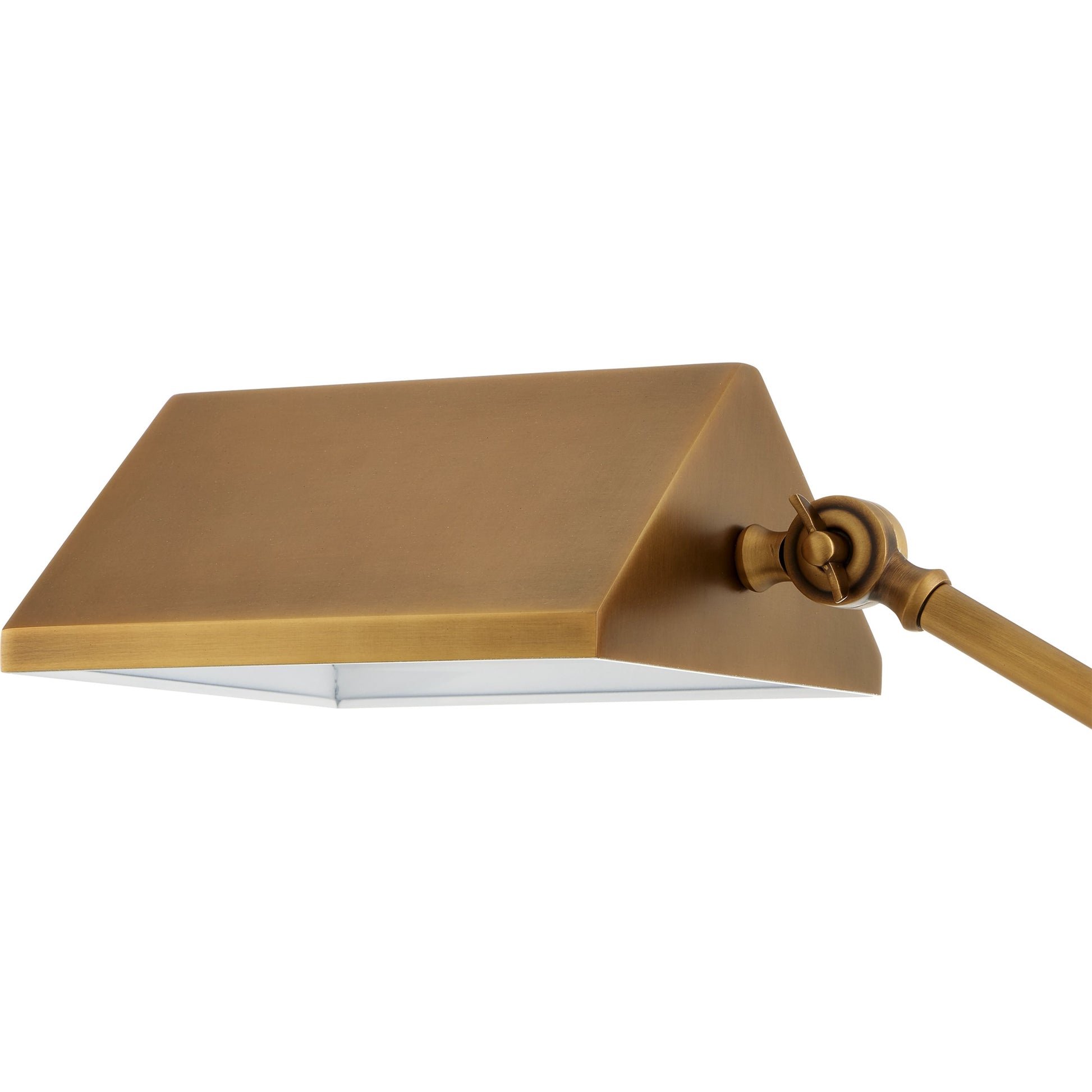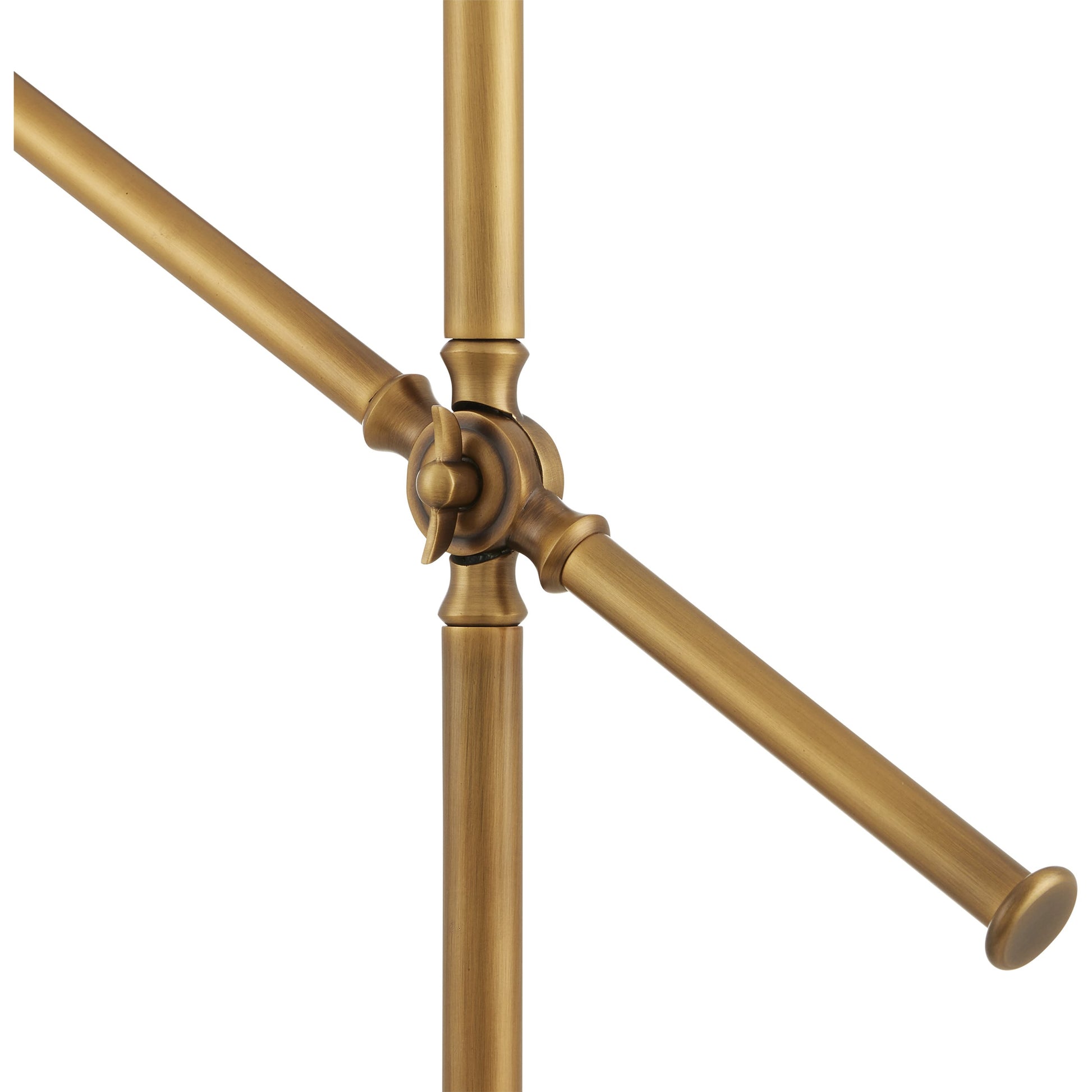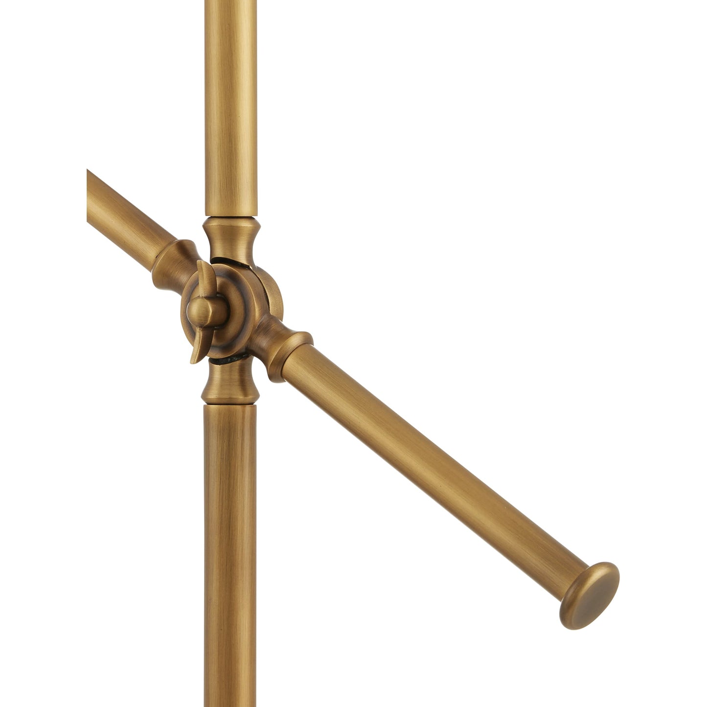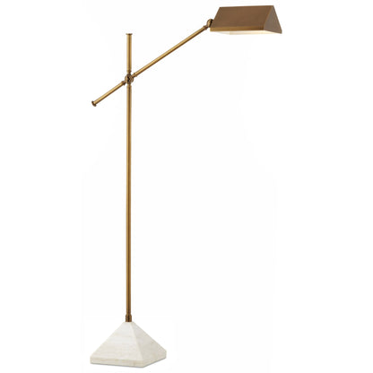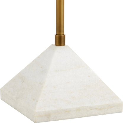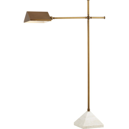 With its base made of a solid pyramid of marble, the Repertoire Brass Floor Lamp is adjustable at the shade and the arm for the ultimate in flexibility. The antique brass-finished metal is a warm contrast to the pale white marble. Though the shape of the shade brings the gold floor lamp a nostalgic touch, the contemporary design with its seriously thin profile has an ultra modern feel to it.