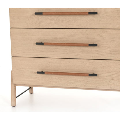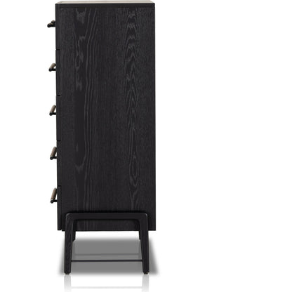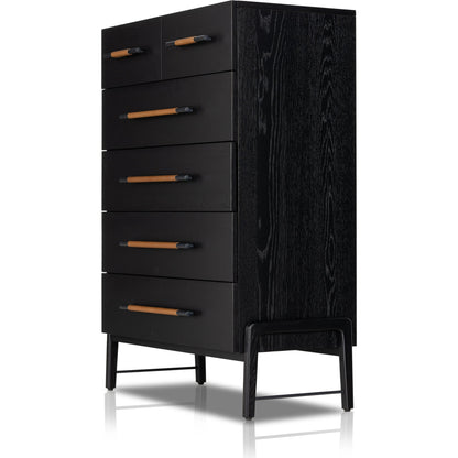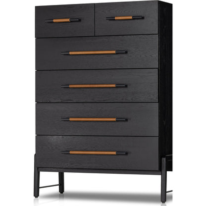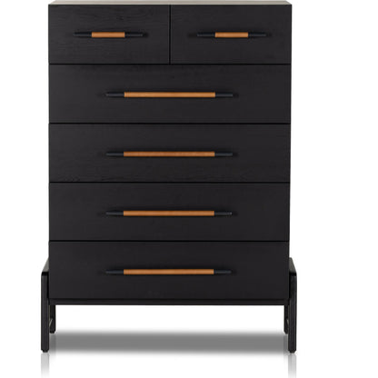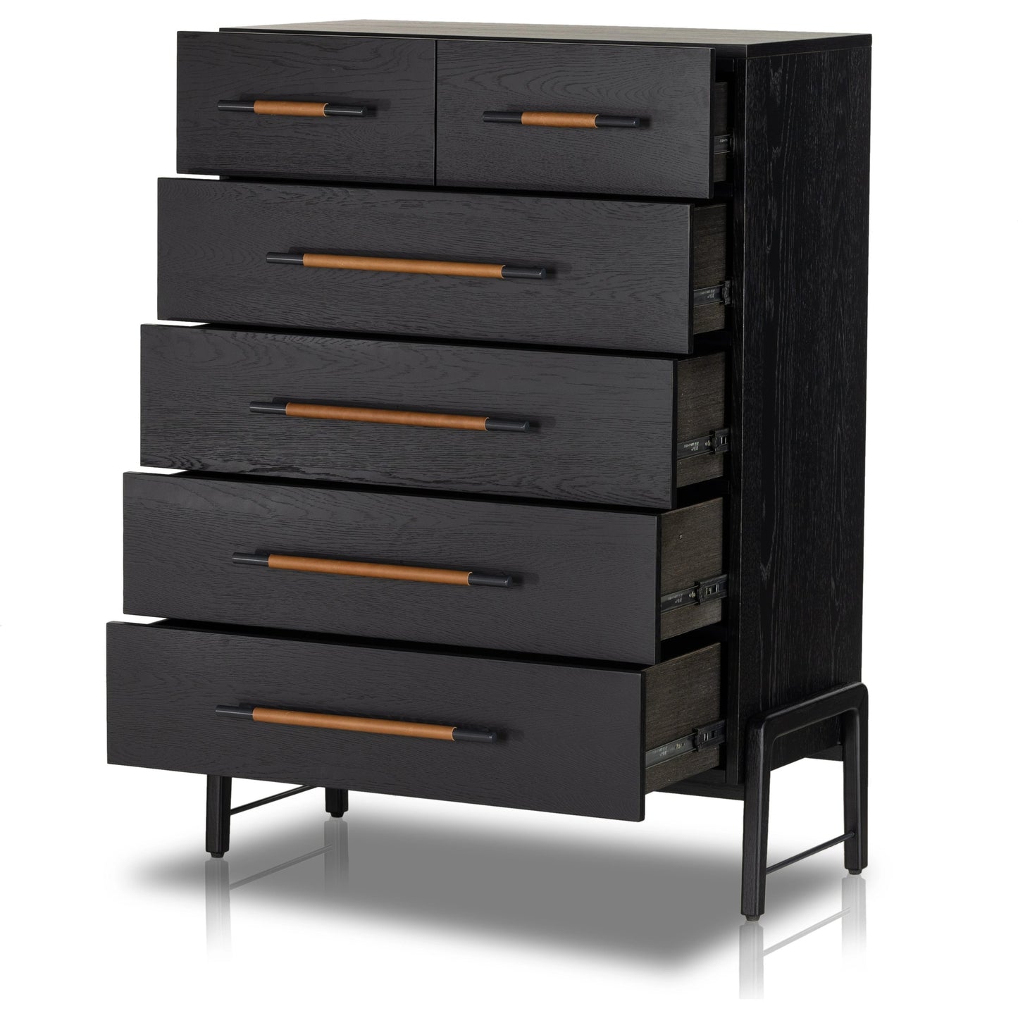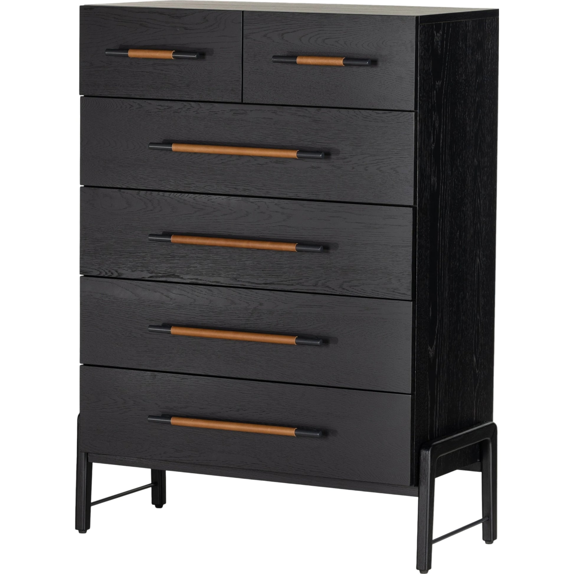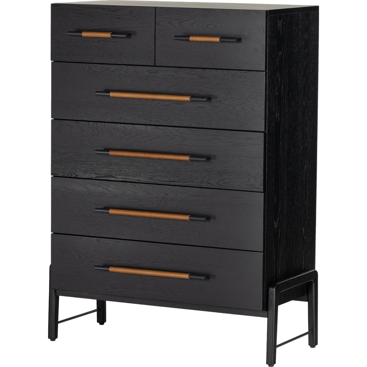 Ebony-finished oak forms a clean silhouette for six spacious drawers with iron hardware wrapped in tan top-grain leather.