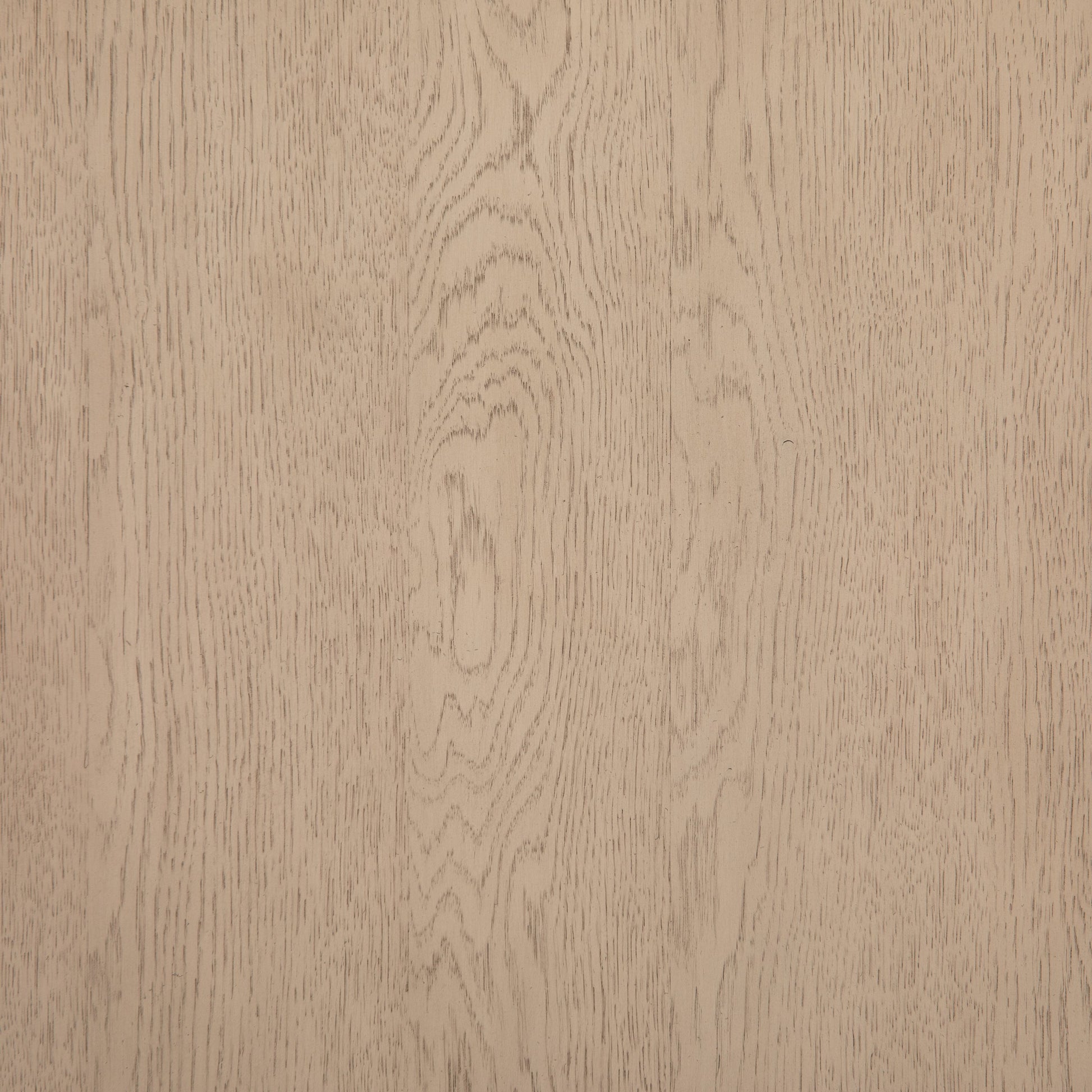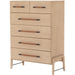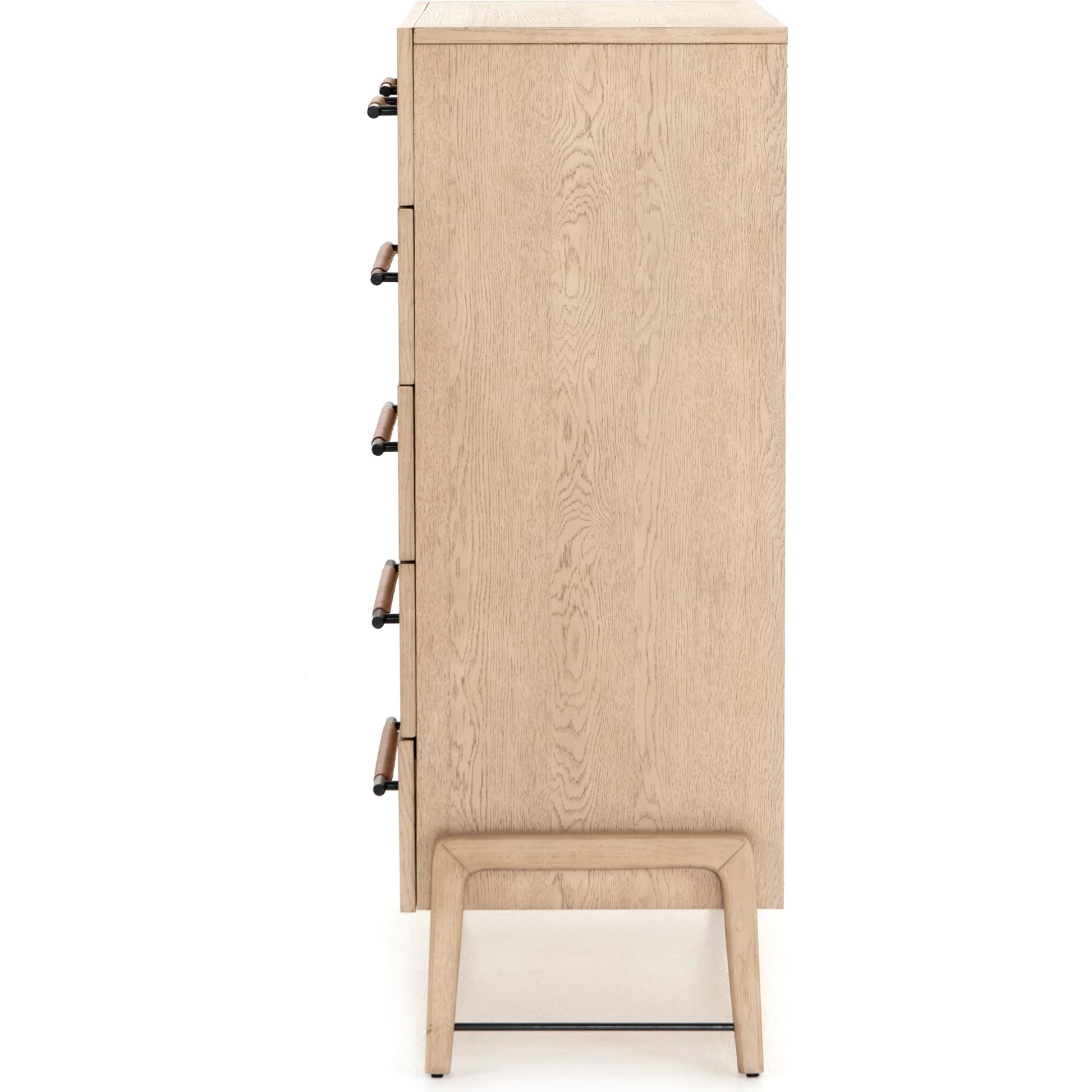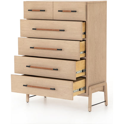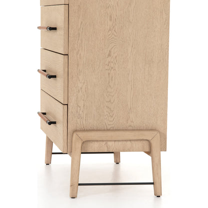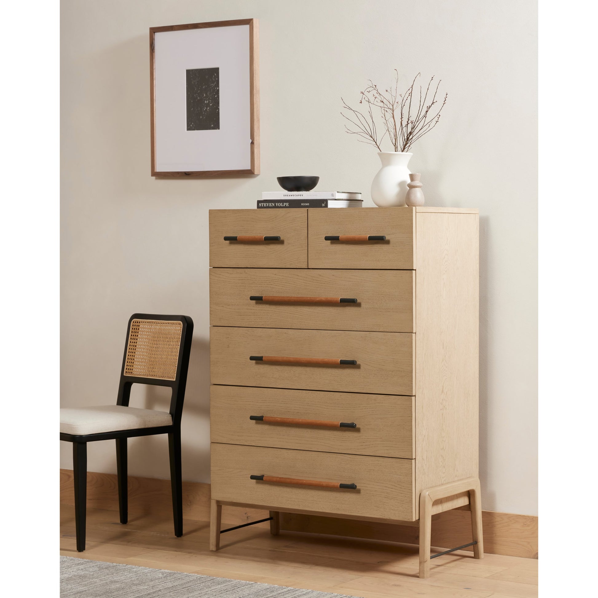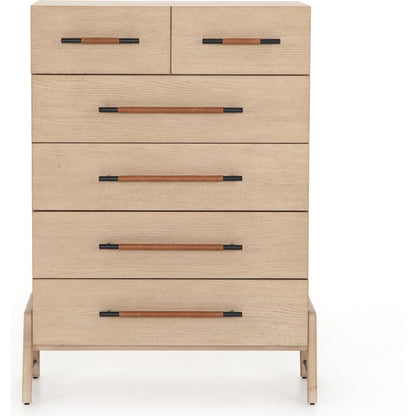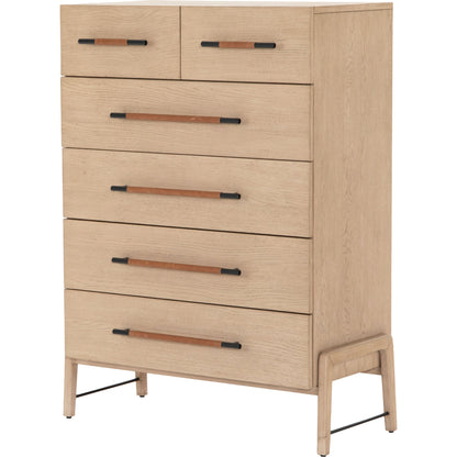 Ebony-finished oak forms a clean silhouette for six spacious drawers with iron hardware wrapped in tan top-grain leather.