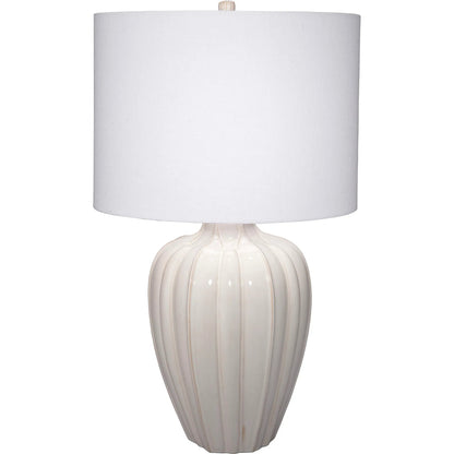 With its casually elegant cream palette, this table lamp can brighten any room even before it is switched on! The ribbed base is expertly handcrafted of cream ceramic, as is the coordinating finial. The drum shade is in white linen. This is a particularly pleasing style choice when placed against richly polished wood.