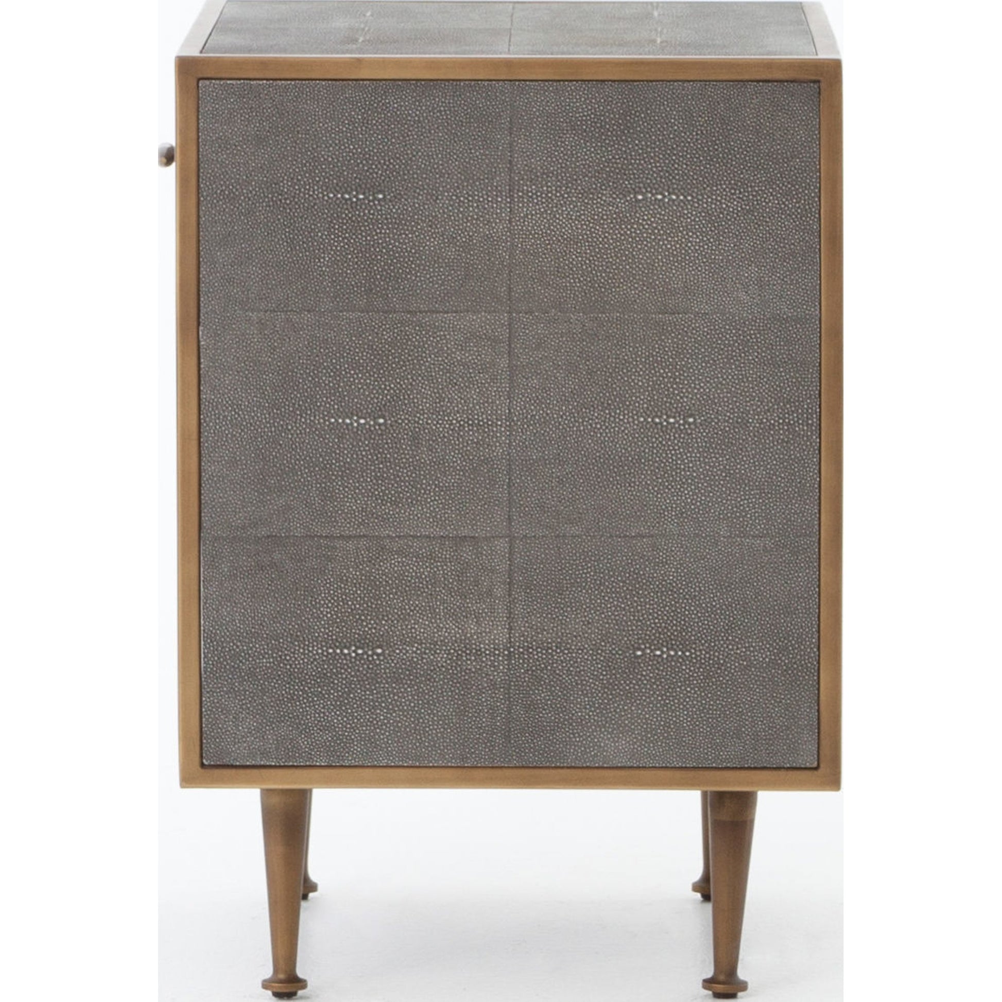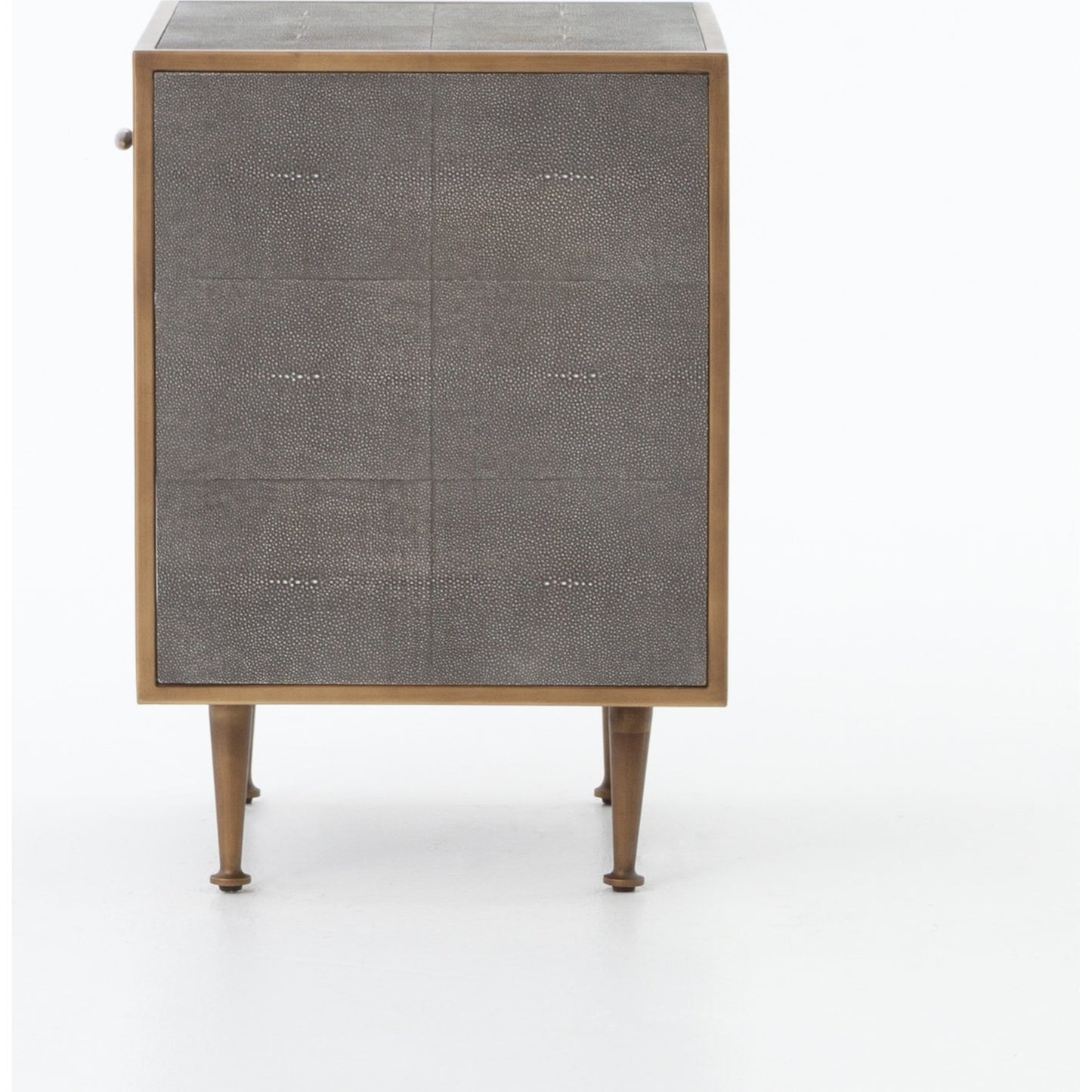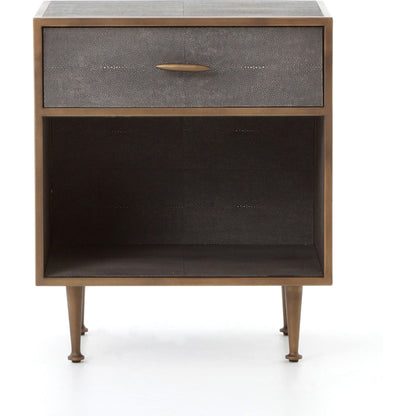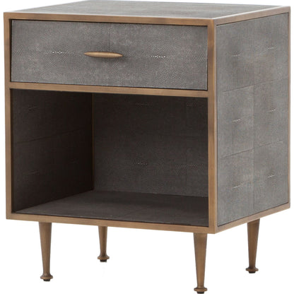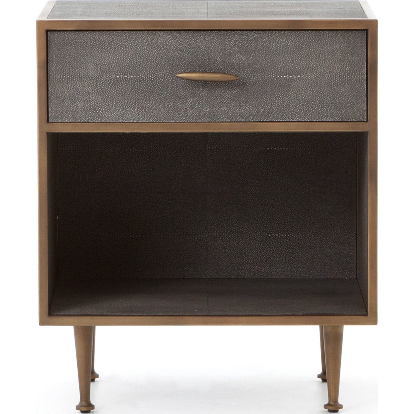 Mid-century shaping takes on modern intrigue in a faux shagreen. A perfectly cubed bedside table with a drawer for storage with finished accents.