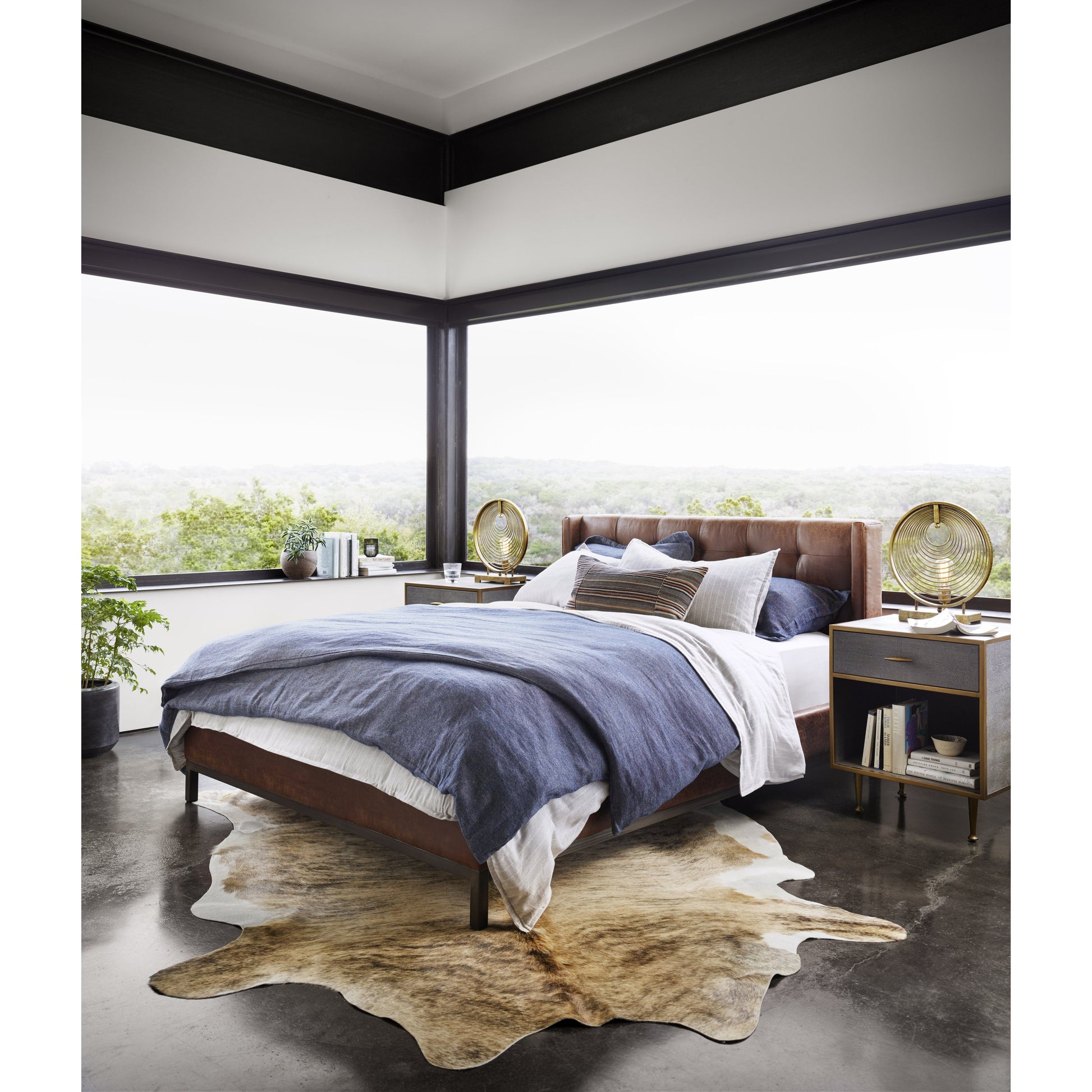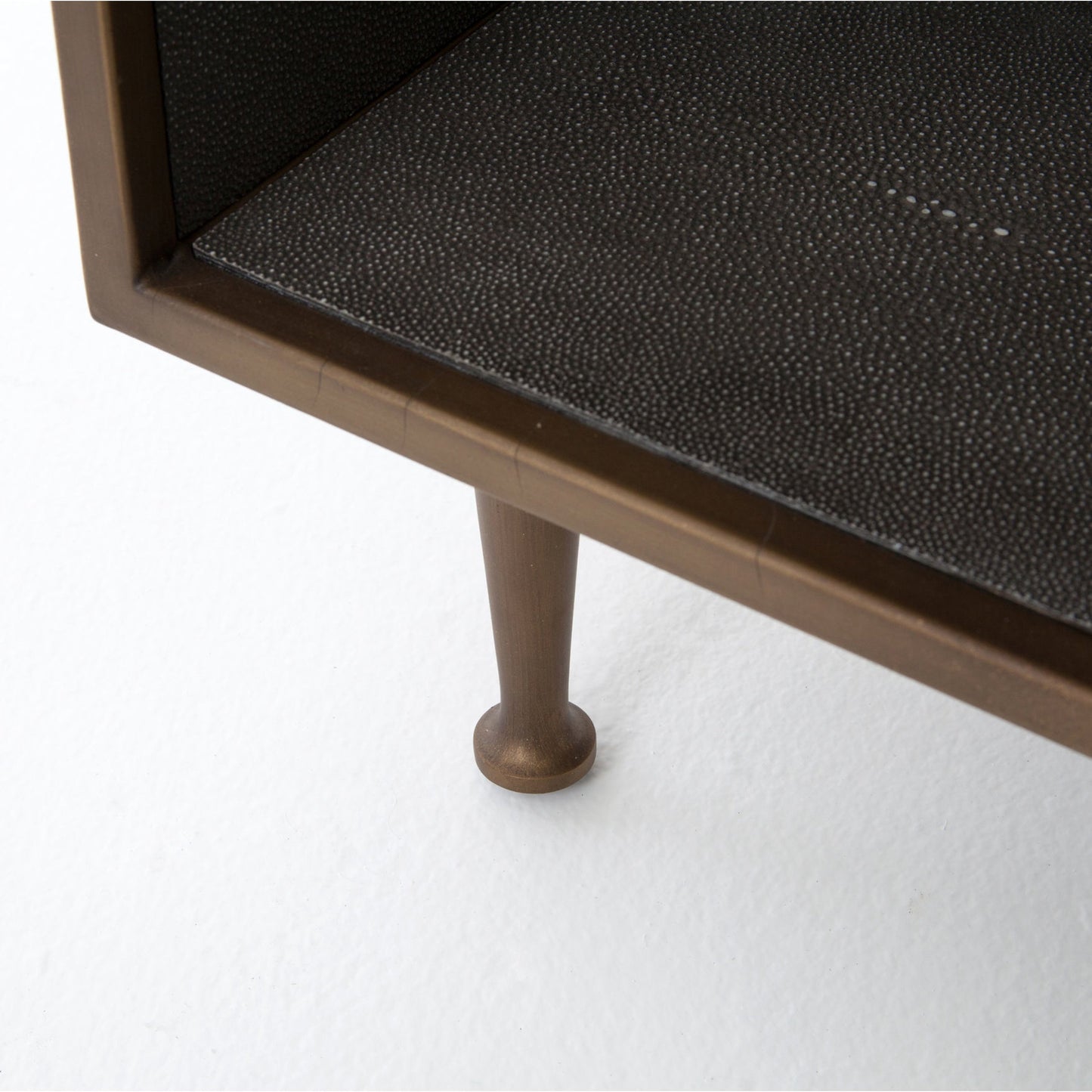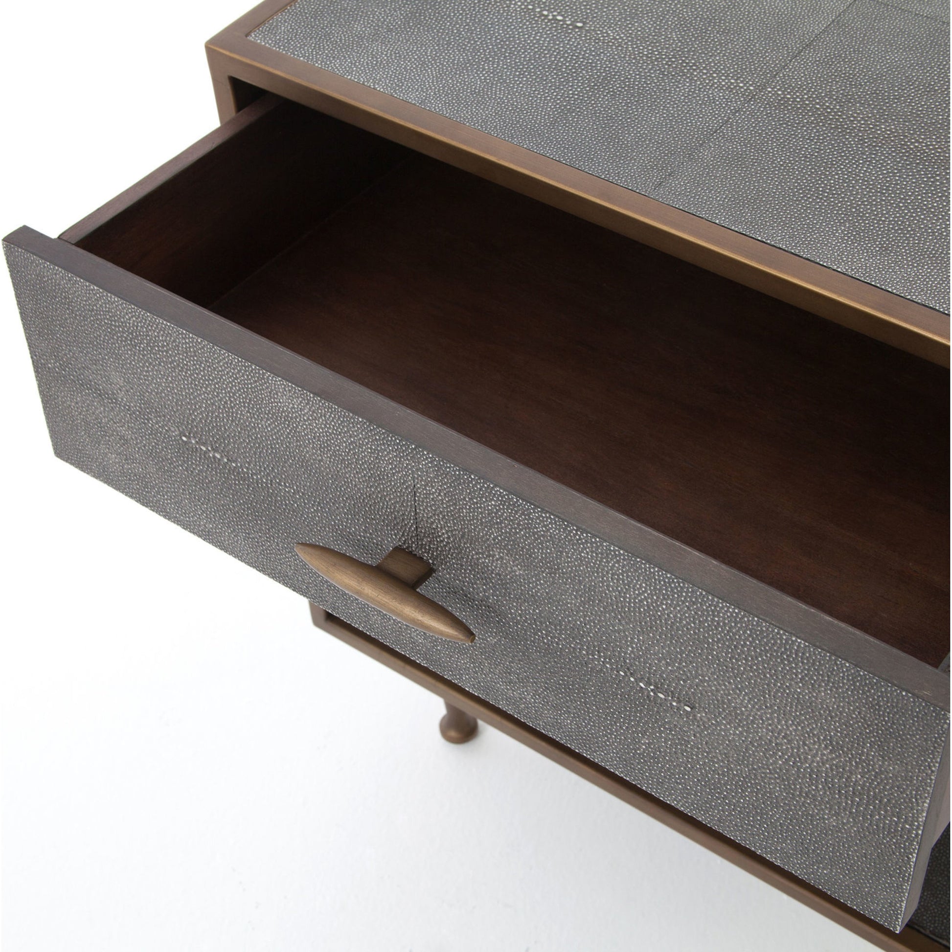 Mid-century shaping takes on modern intrigue in a faux shagreen. A perfectly cubed bedside table with a drawer for storage with finished accents.