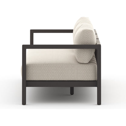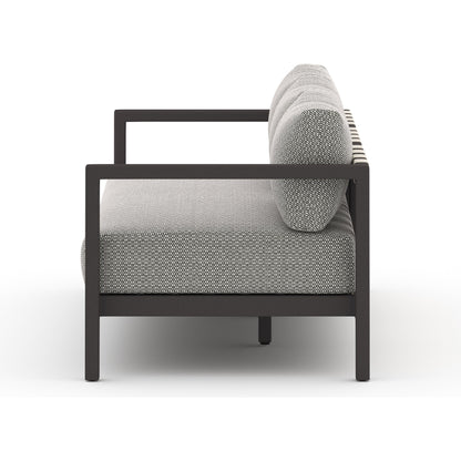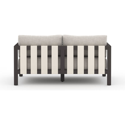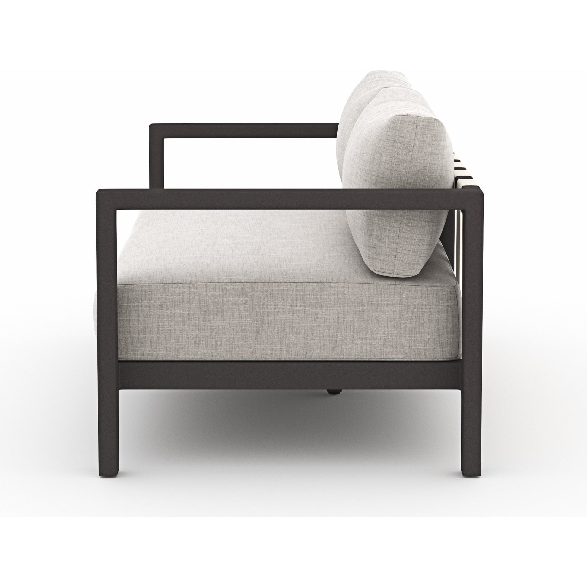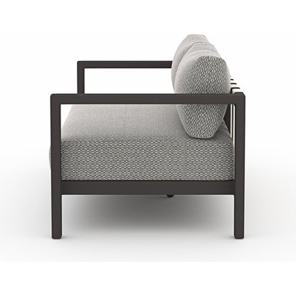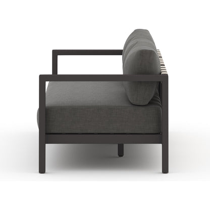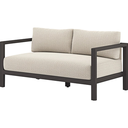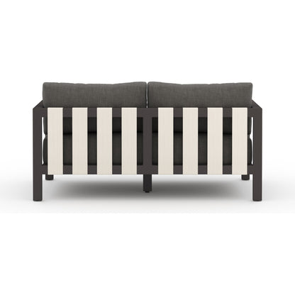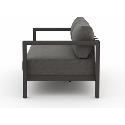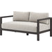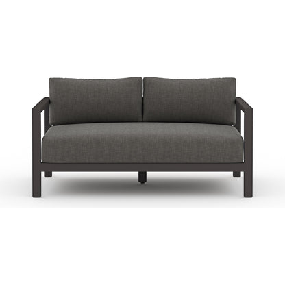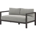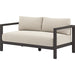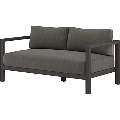Modern materials ready a stylish silhouette for the outdoors. Bronze-finished teak forms a two-seat frame for UV-resistant and water-repellent Sunproof fabric in an inviting charcoal. Rear ivory straps add intrigue. Cover or store indoors during inclement weather and when not in use.