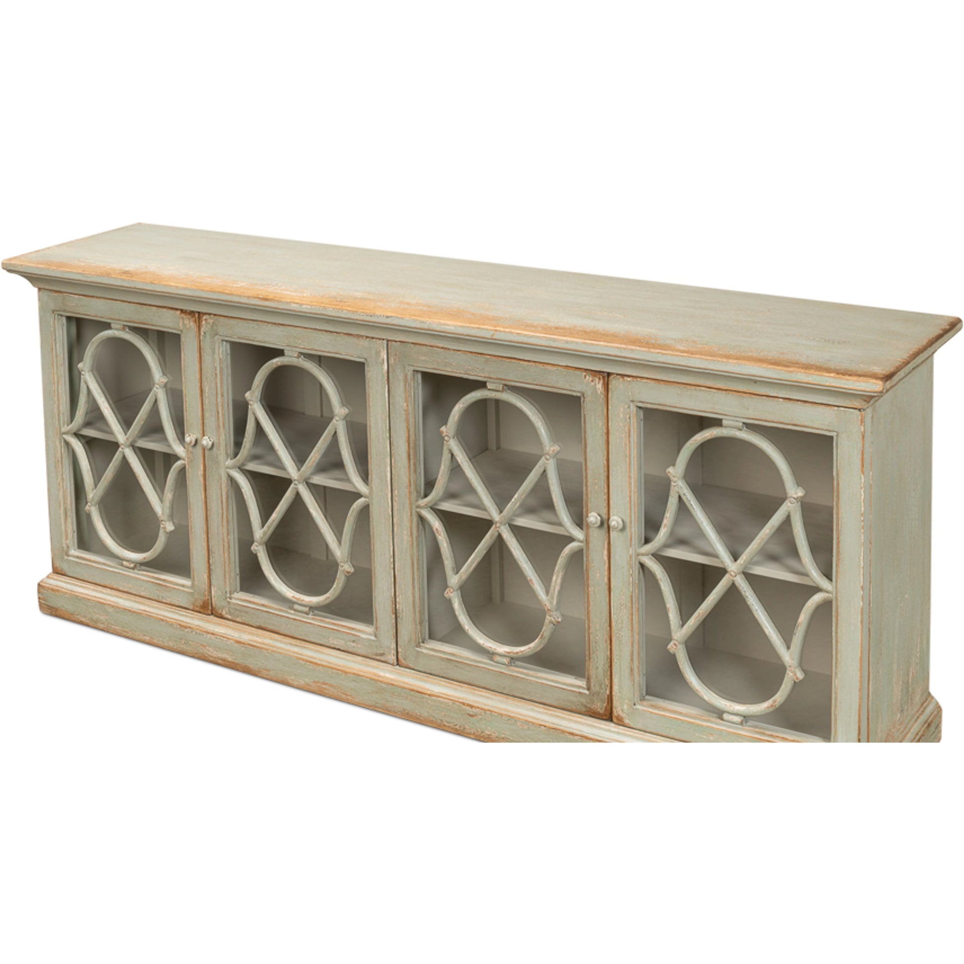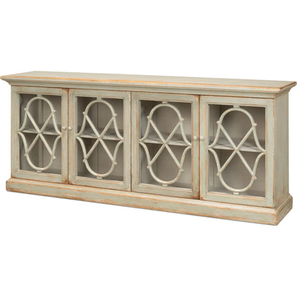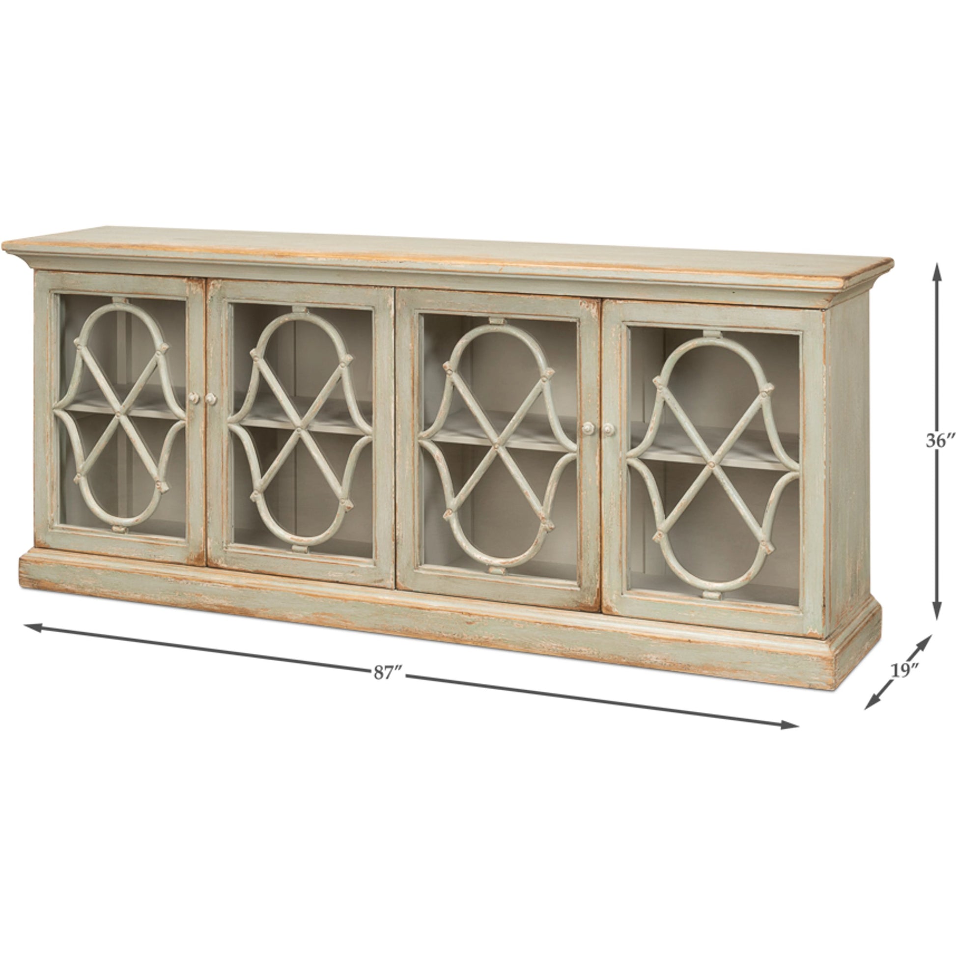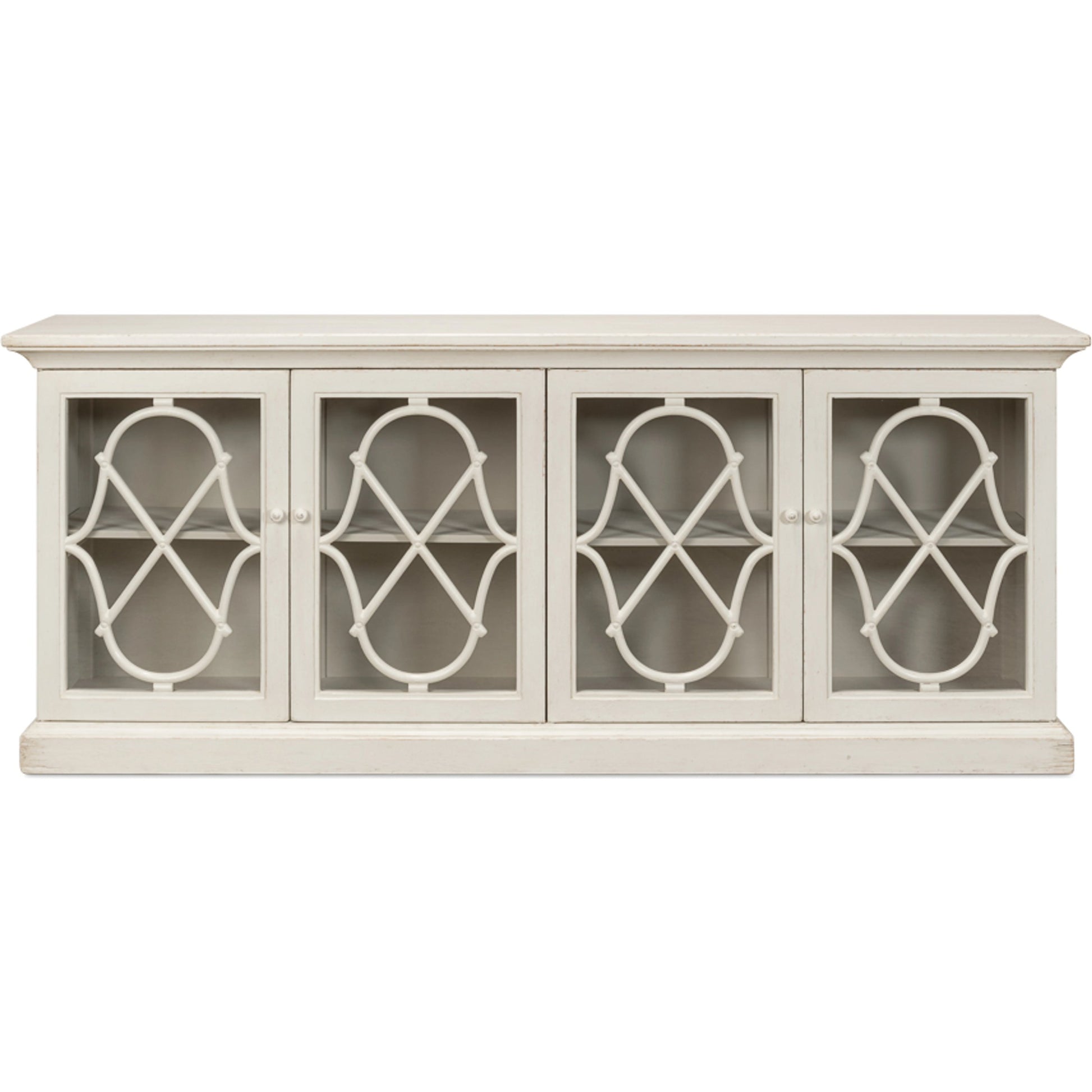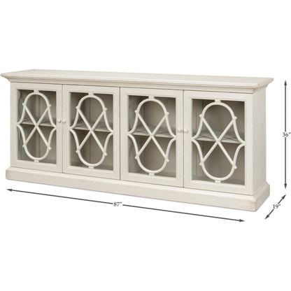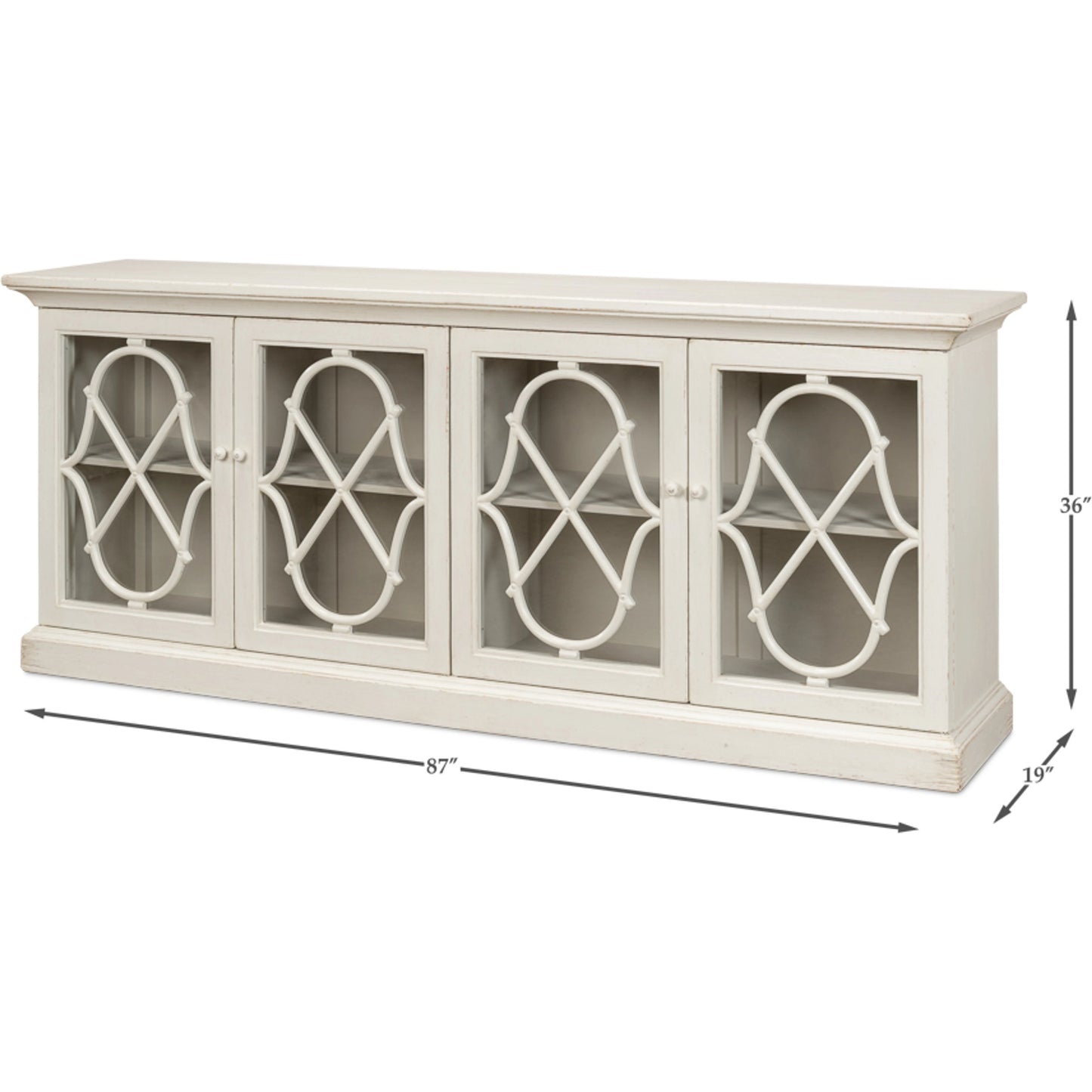 While it calls to mind 19th century French antiques, this reclaimed pine sideboard is unmistakably Serried with its emphasis on high drama and a high function, set apart with a graceful, feminine fretwork motif. A multi-layer antique white finish and iron hardware gives it the weight of an heirloom in an airy design right for today.