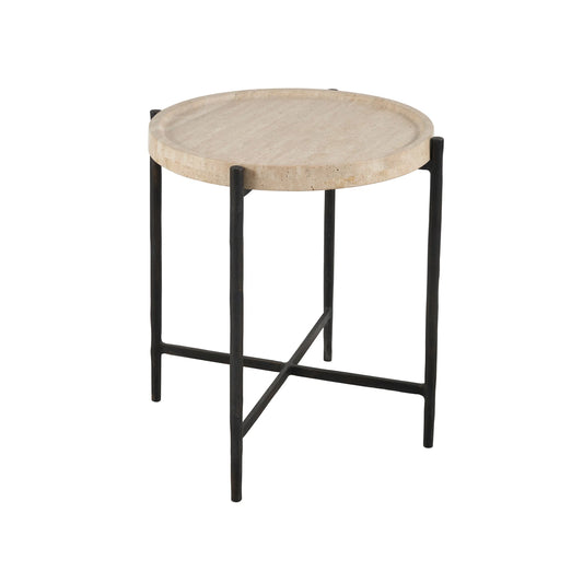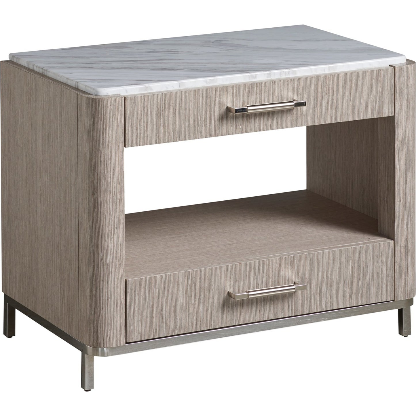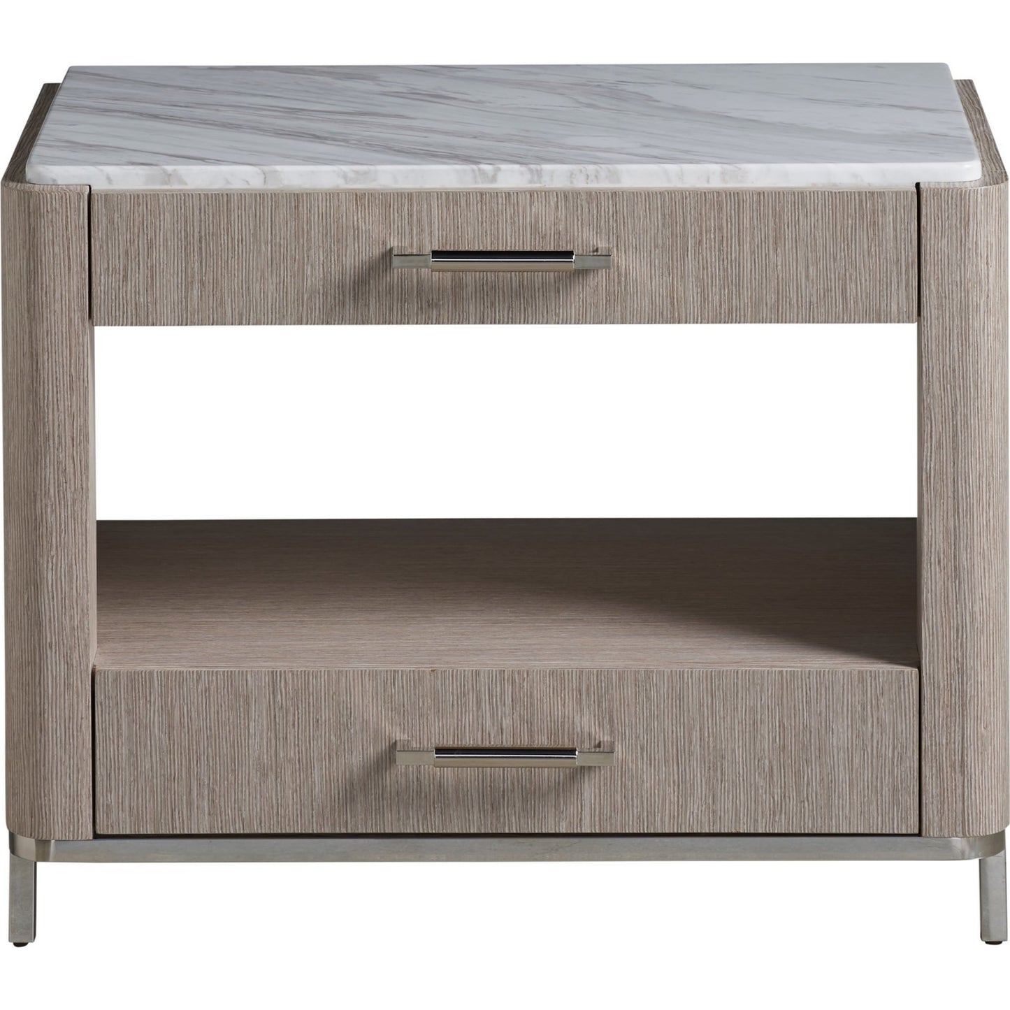 The Soren Bedside Table is a gorgeous marriage of texture and materials, featuring a stone top, sleek bar hardware and a metal base. It includes two spacious drawers and one open-air display shelf.