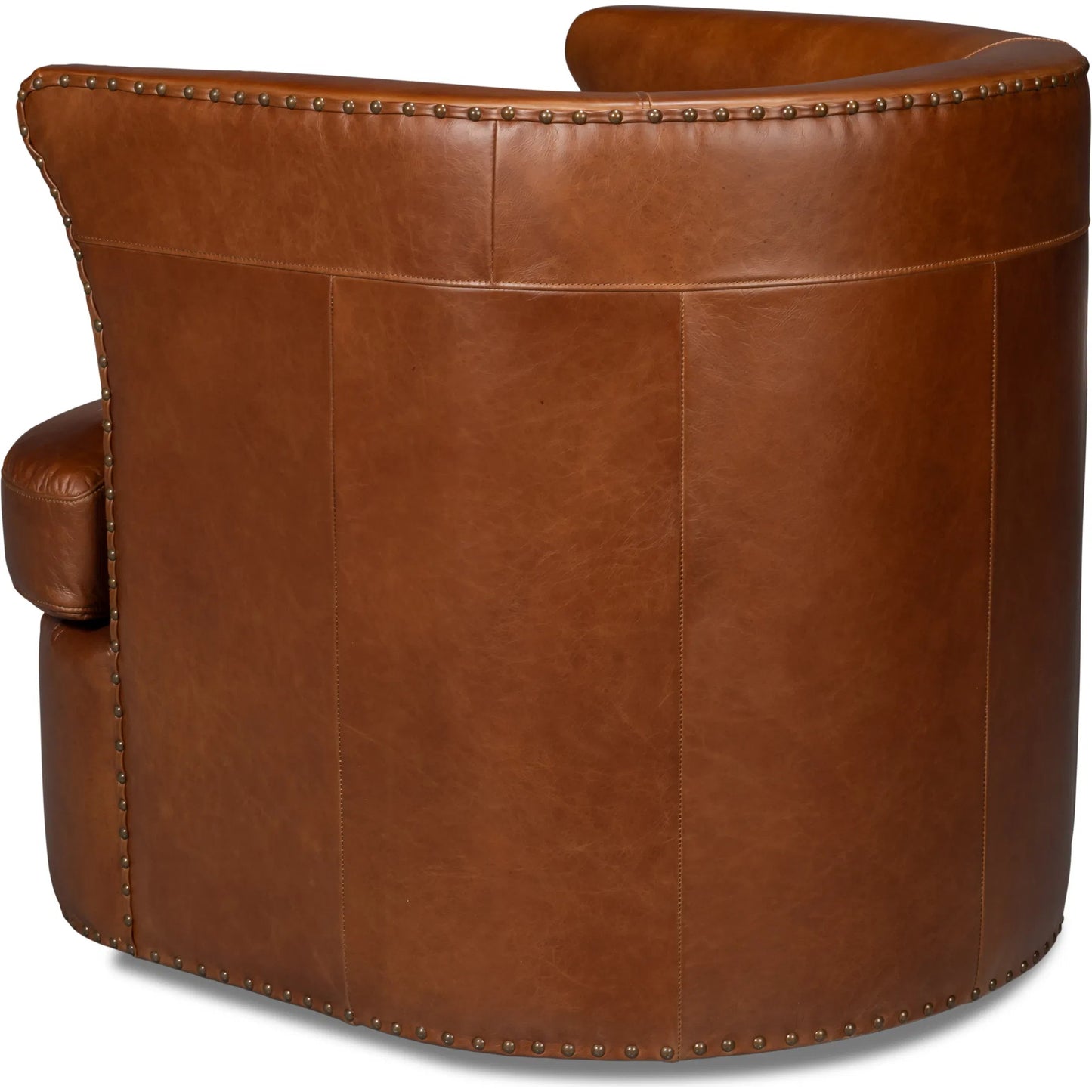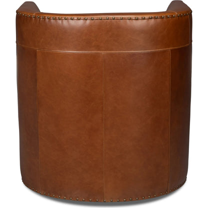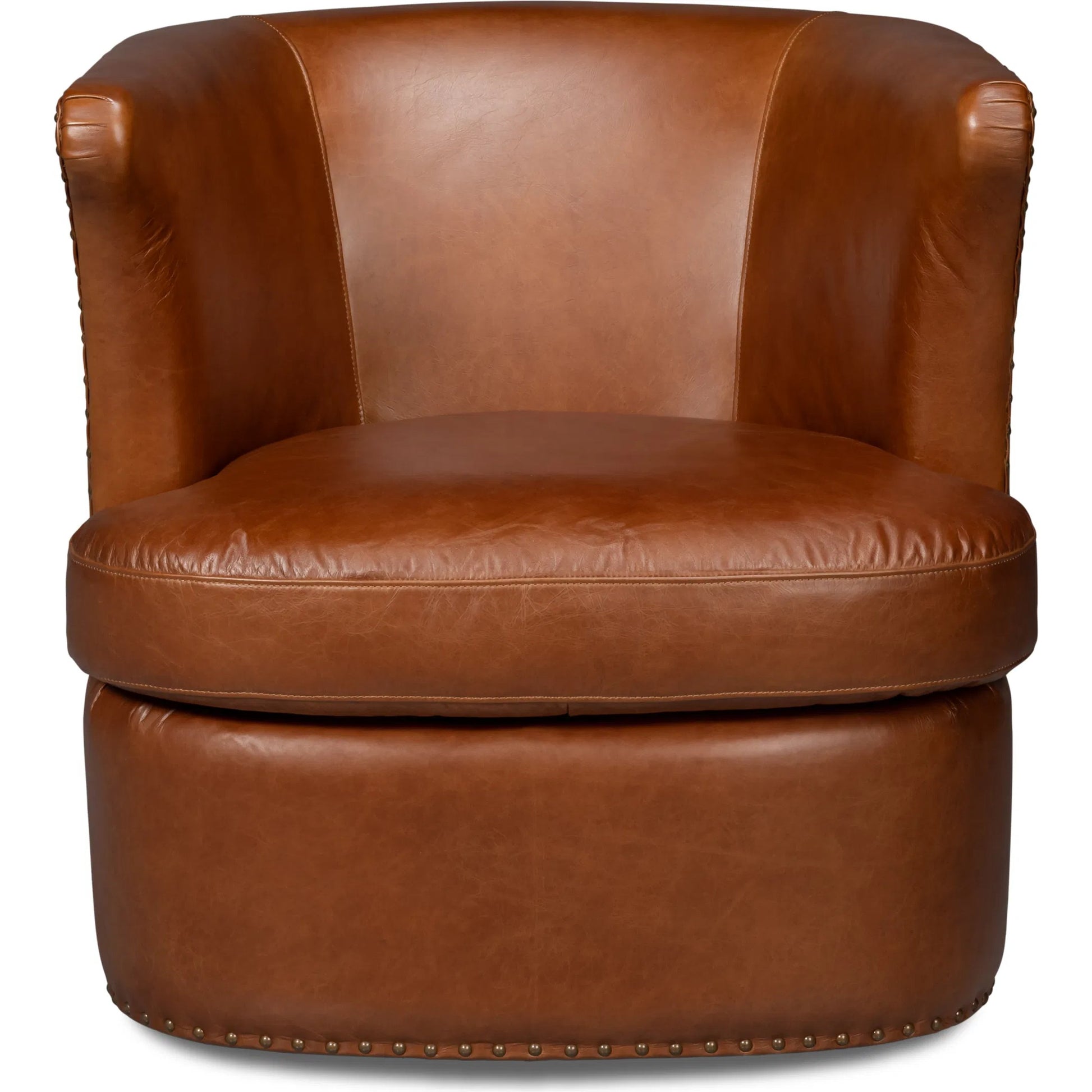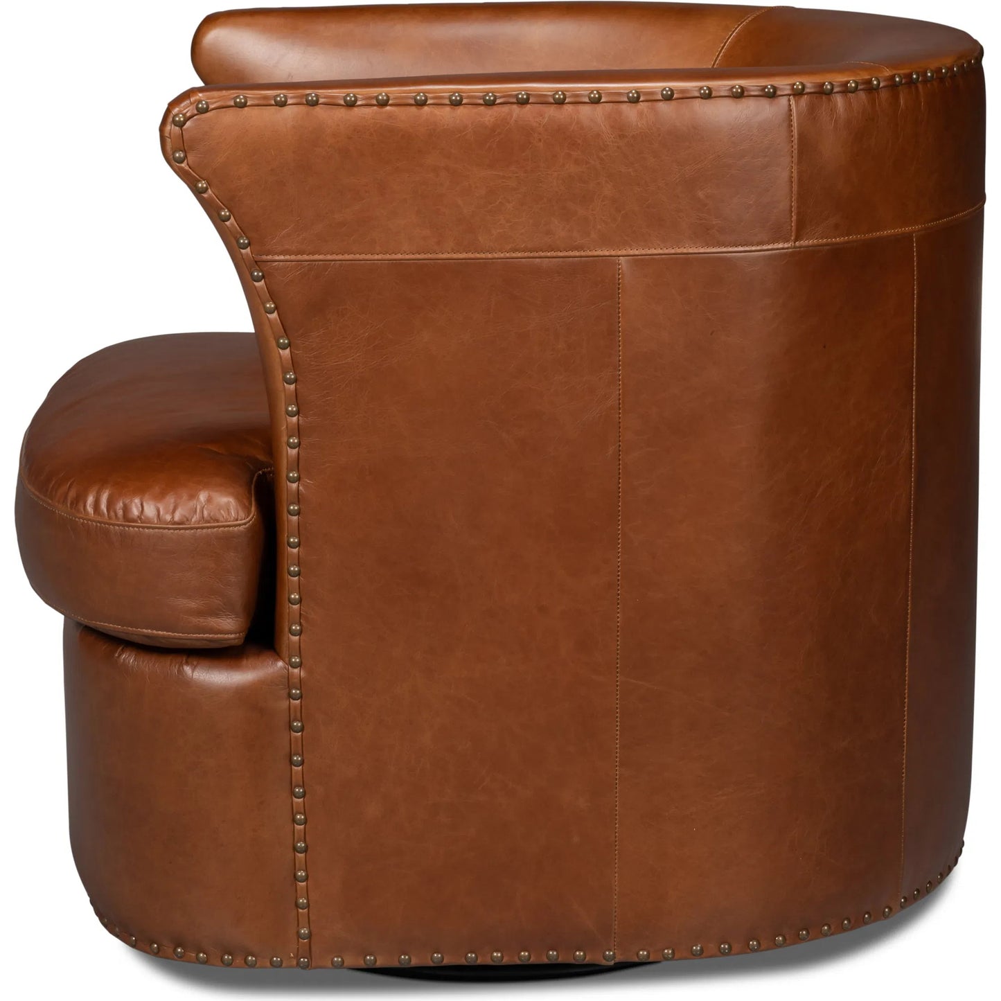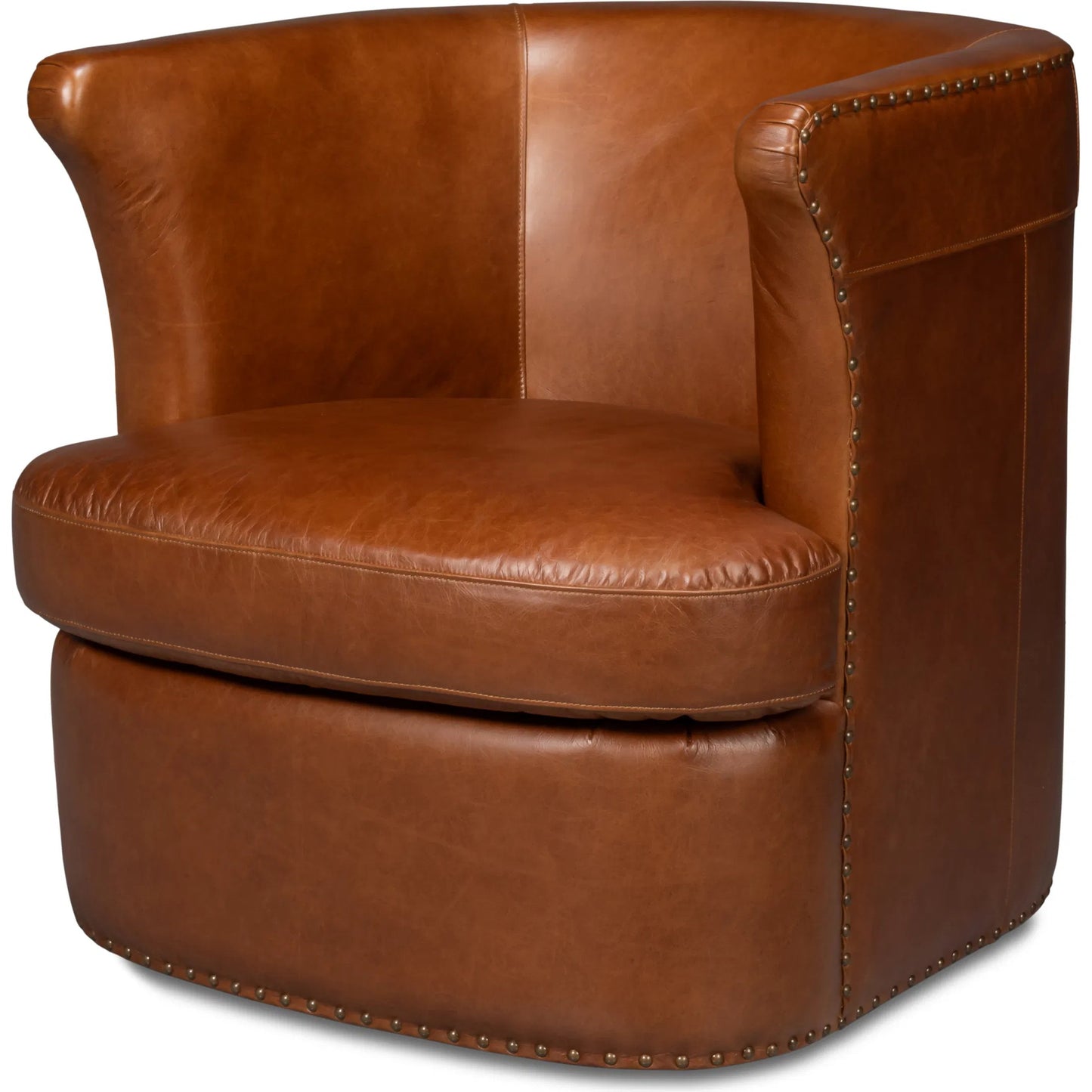 The Spencer Leather Swivel Chair in Havana Brown with antique brass nail heads and swivel base offers both style and comfort for a chic and versatile seating experience.