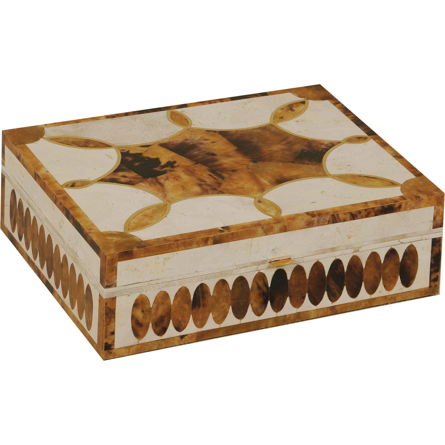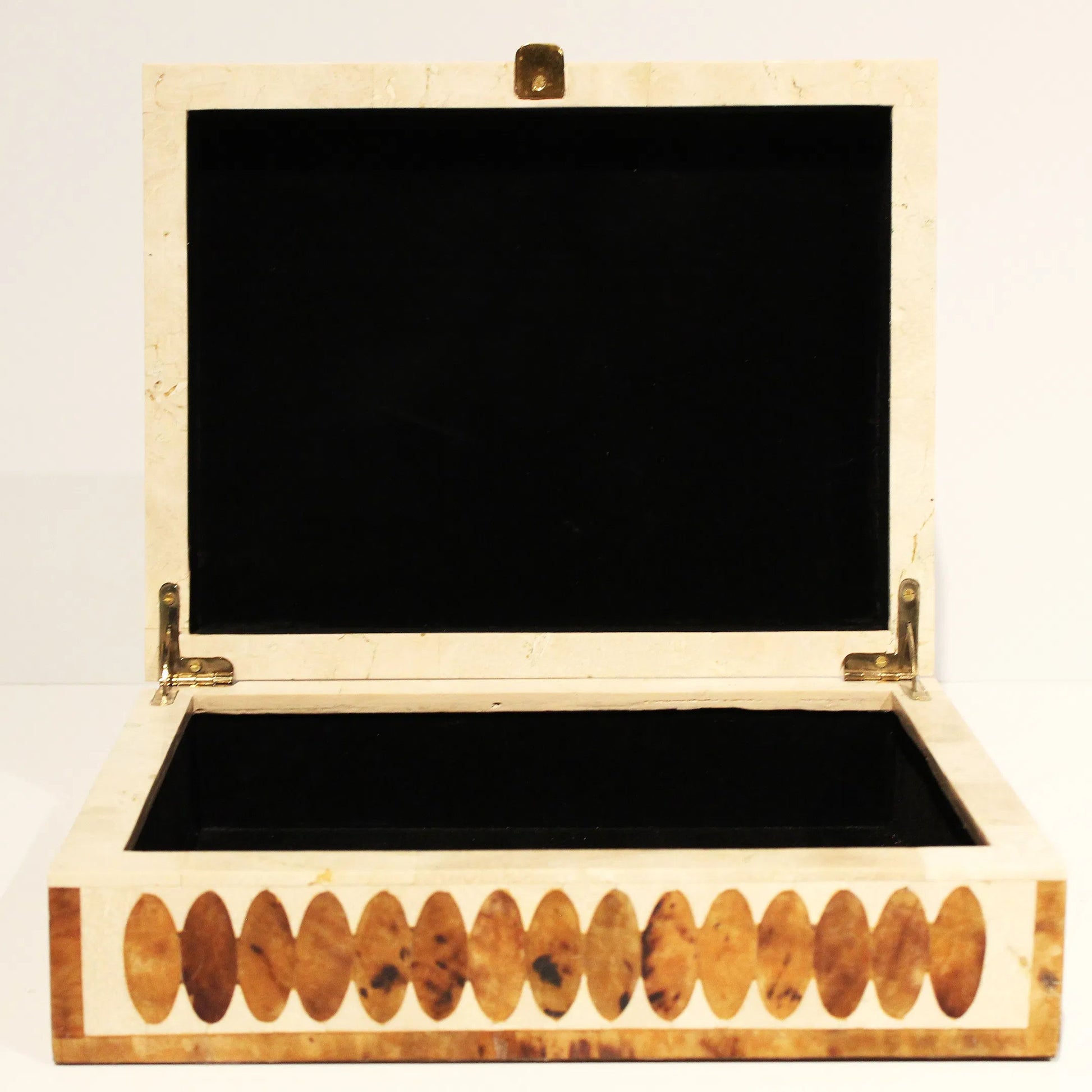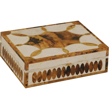 White Fossil Stone and Tiger Penshell Inlaid Box with Polished Brass Accents.