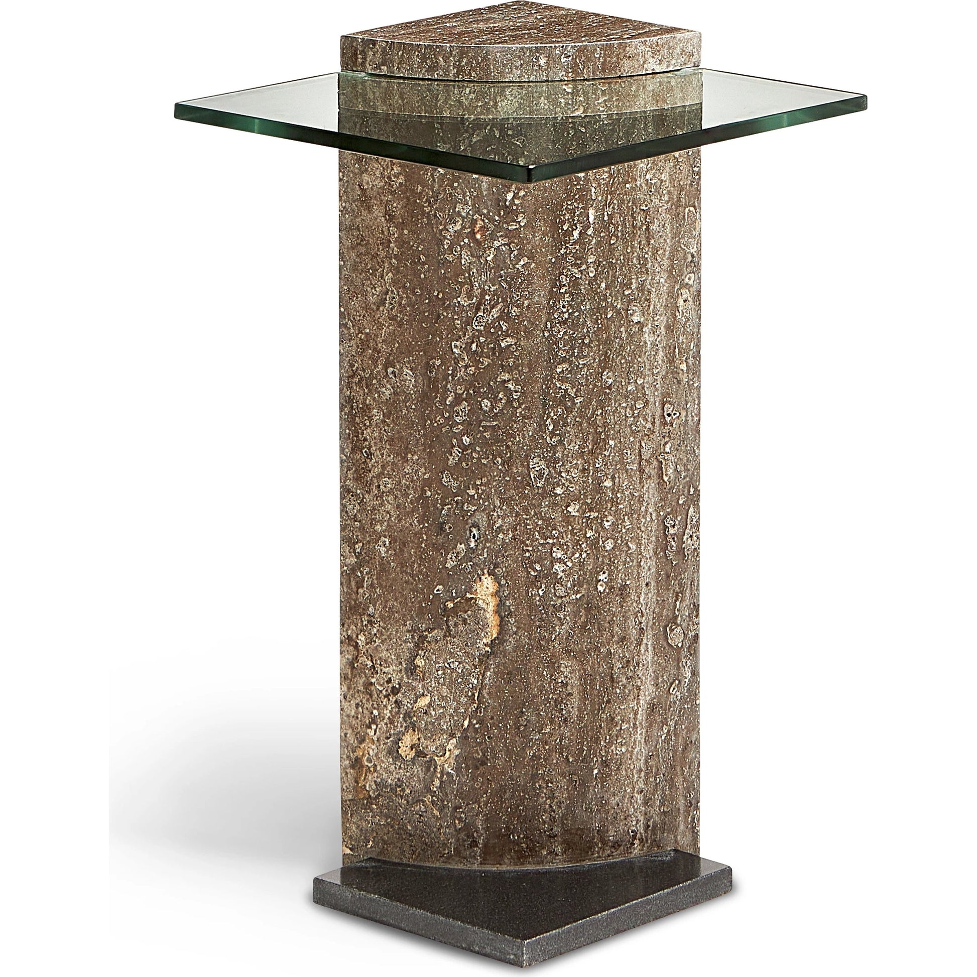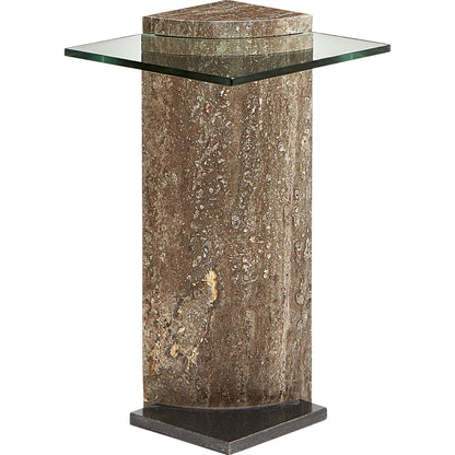 Semi-polished Grey Titanium Travertine pillar side table with a suspended tempered glass top and black stone base.
