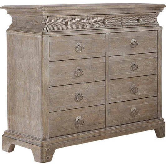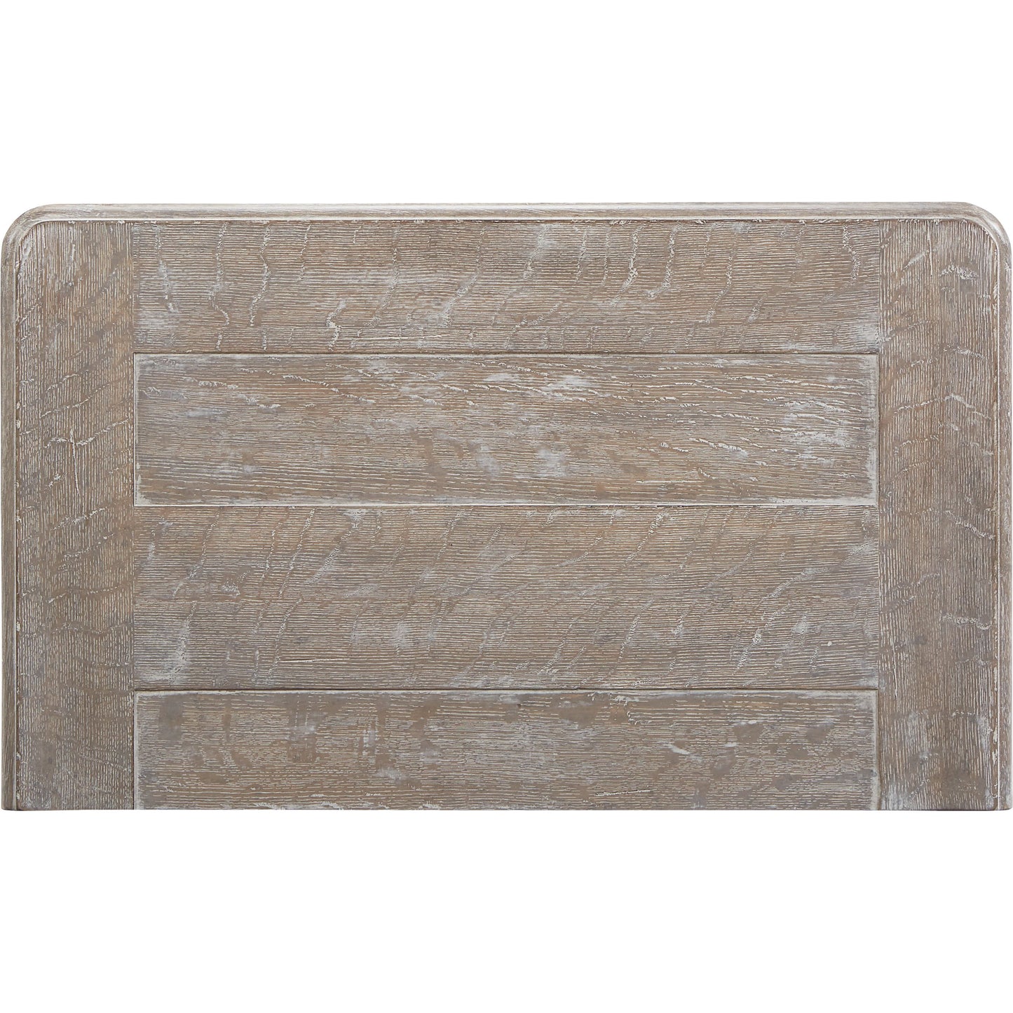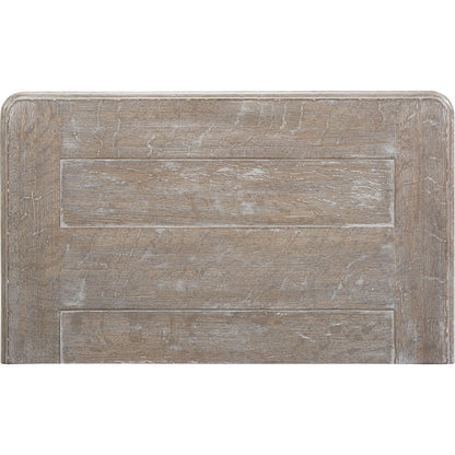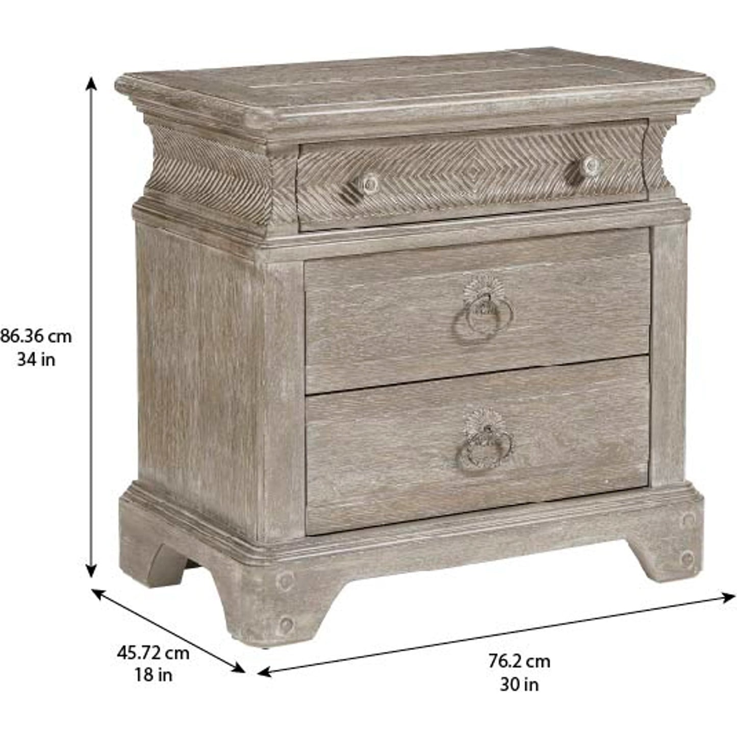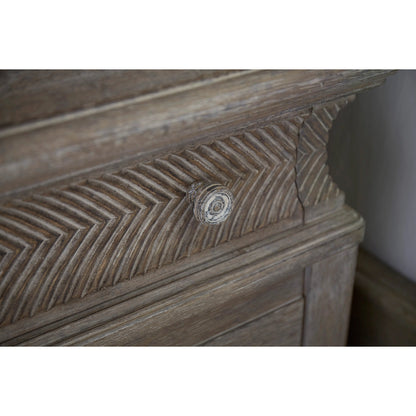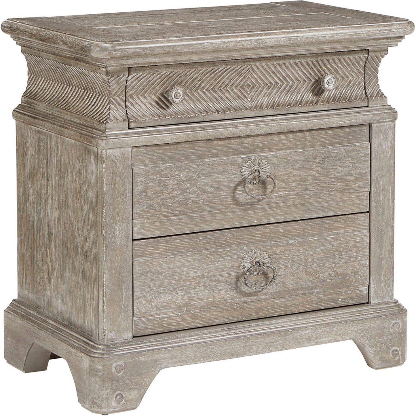 The sturdy little Light Keeper's Bedside Chest has two drawers in its body and a third drawer tucked into the concave upper box banded with chevron carving. Artisanal details include molding around top and base; vintage-inspired drawer pulls rubbed with antique white; and wooden pegs on the bracket feet. The oak chest's scrubbed finish brings out the beauty of the wood's grain.