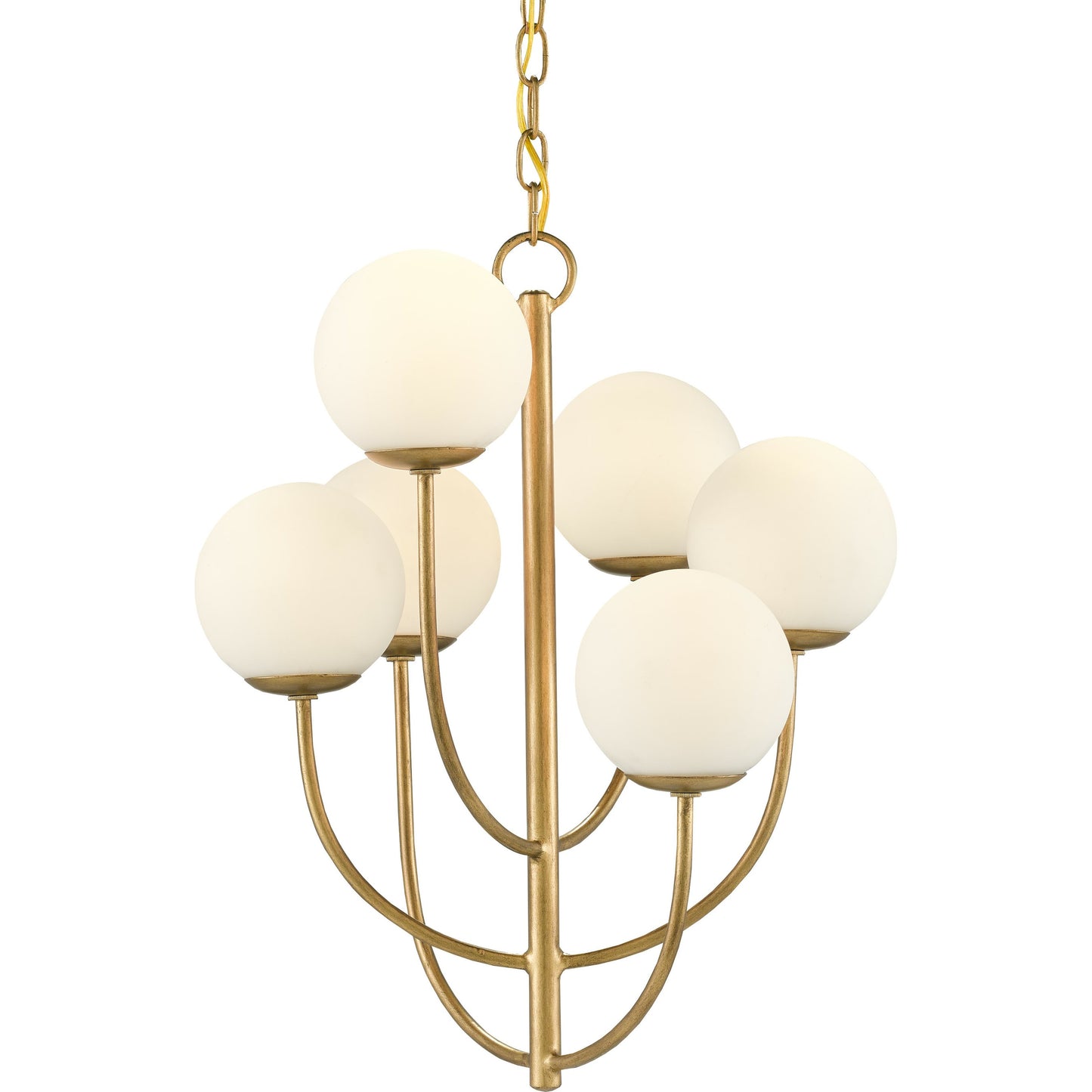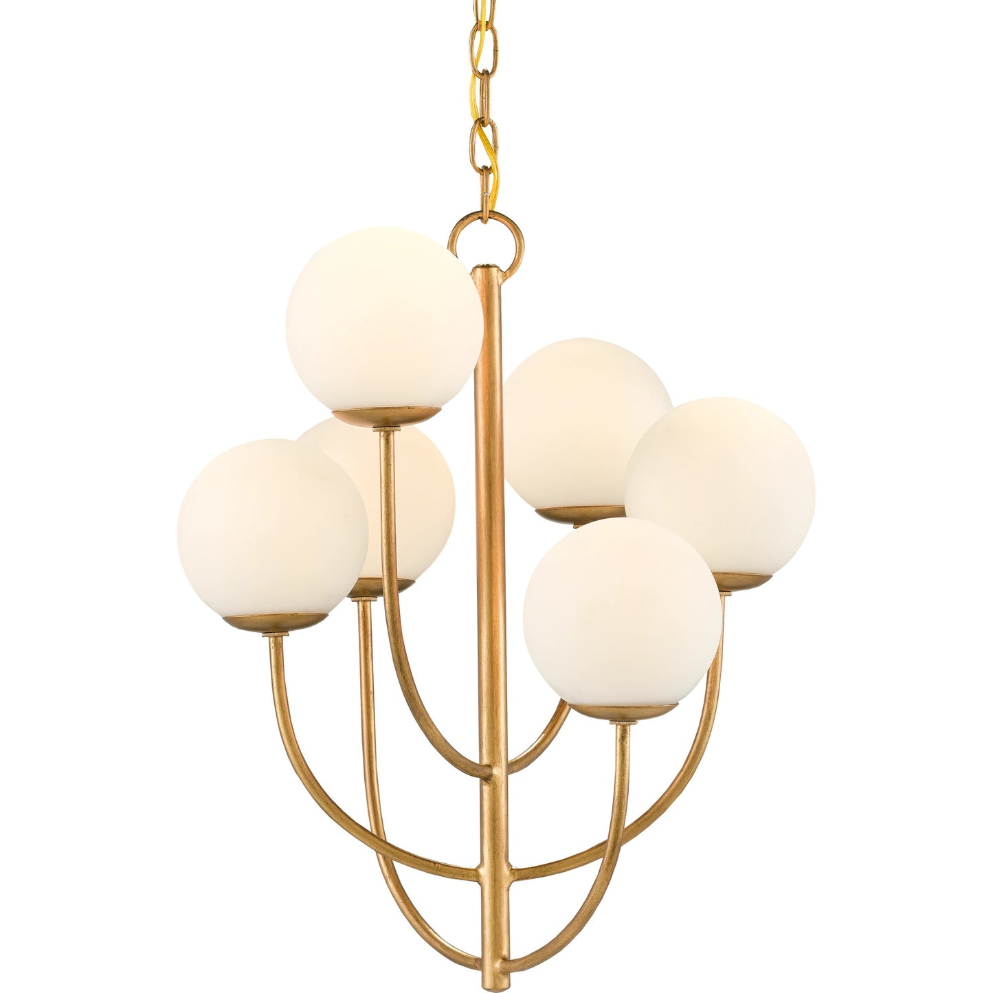 When mid-century modern was at its height, white glass globes were central to the designs produced by some of the greatest visionaries who've ever conceived products for the home. The Sunnylands Chandelier has this verve in its DNA. Made of wrought iron in a new brass finish, the long thin stem and arcing arms hold six opaque white glass globes in a staggered design that makes it seriously chic.