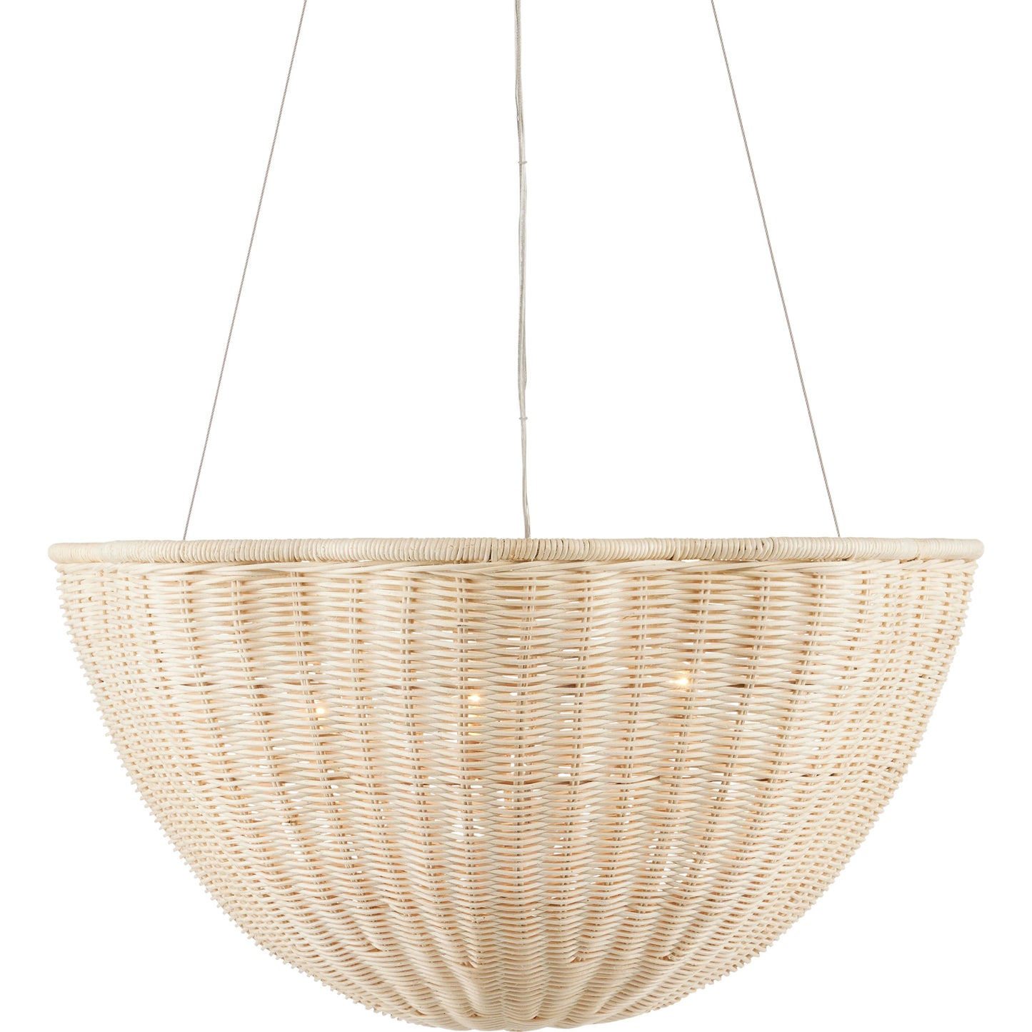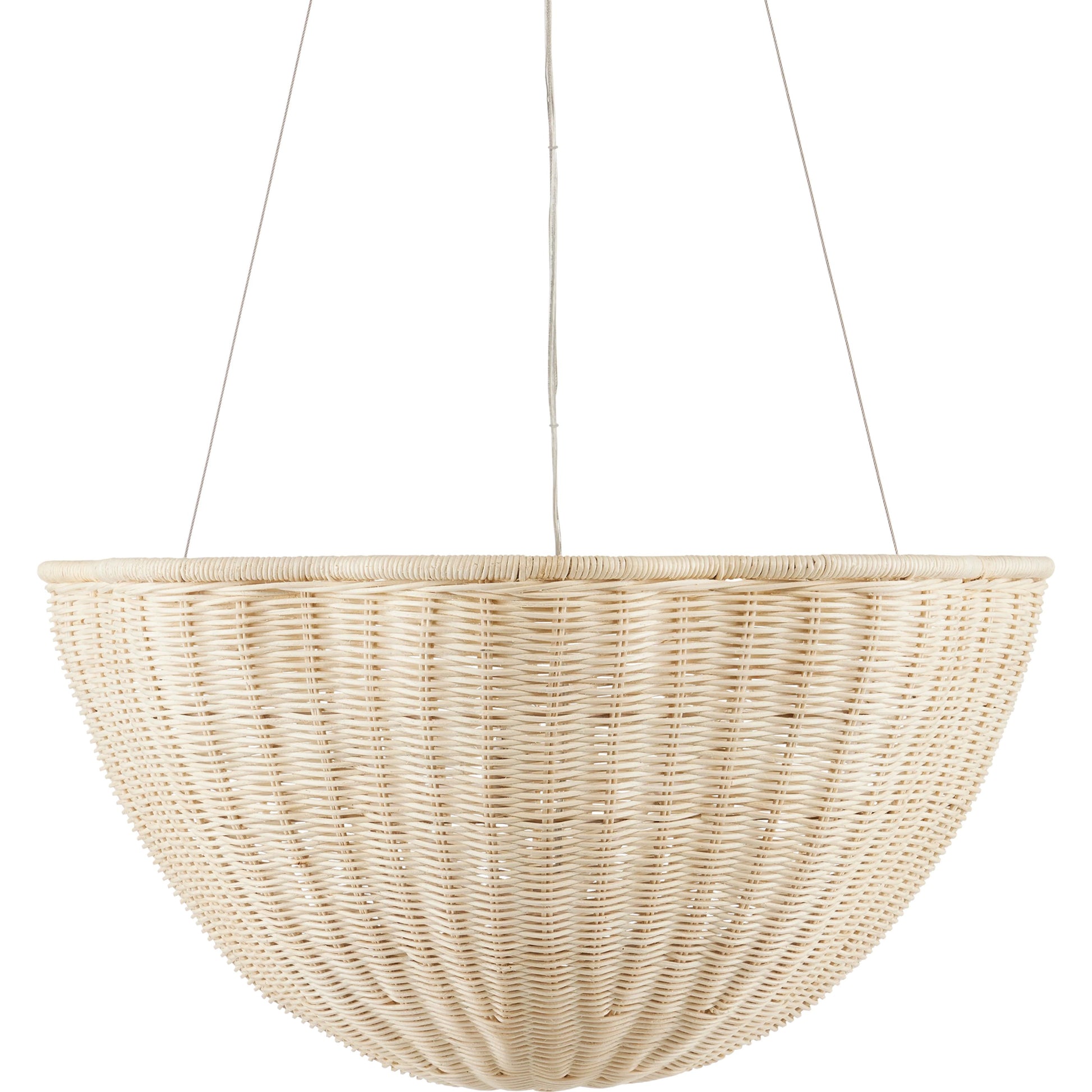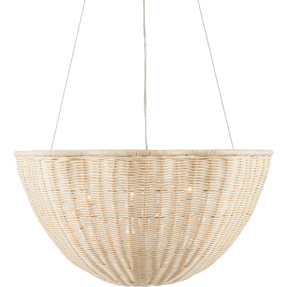 The Telos Pendant is made of wicker that has been bleached for a lighter feel. The beige pendant is perfect for spaces where an abundance of uplight is needed. The wicker pendant with its bowl-shaped profile is scalloped, though this is not obvious when viewed from the side. Given the nature of the woven natural material, pinpoints of light will waft through in spots.