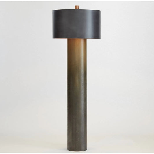 Sheet Steel gives this lamp rich textural interest, especially when dipped in acid. Bronze metal shade. Antique Brass Base and Bronze finial