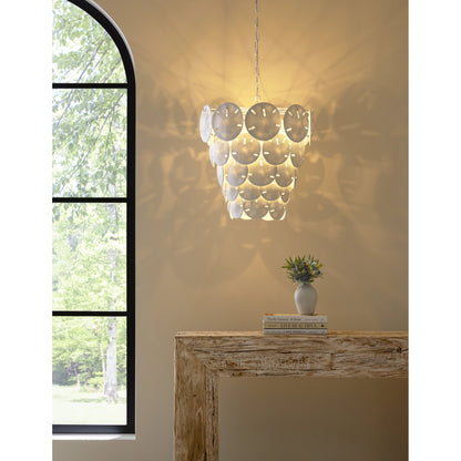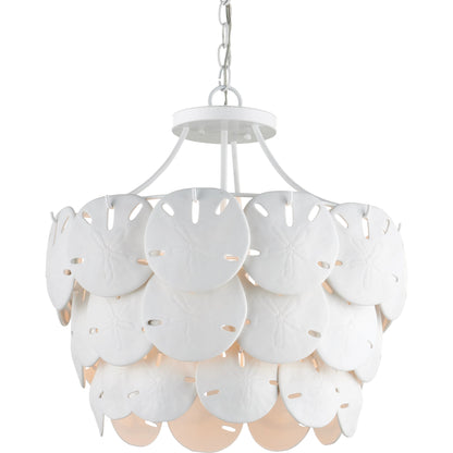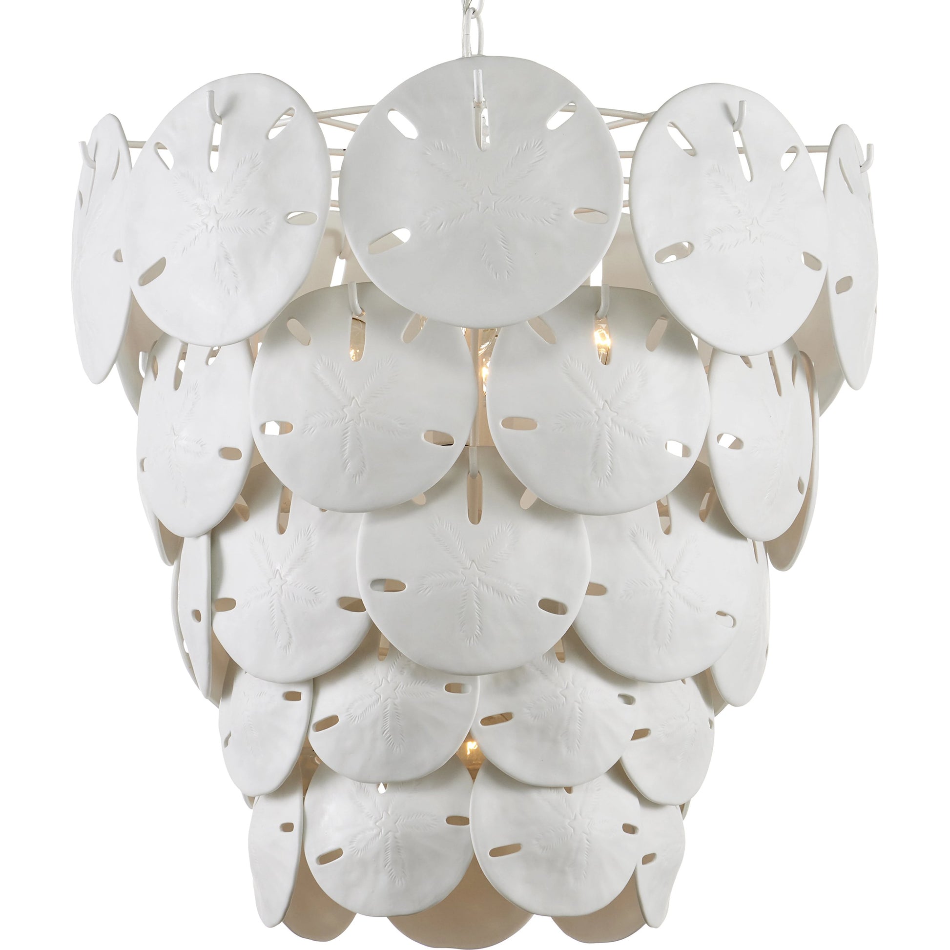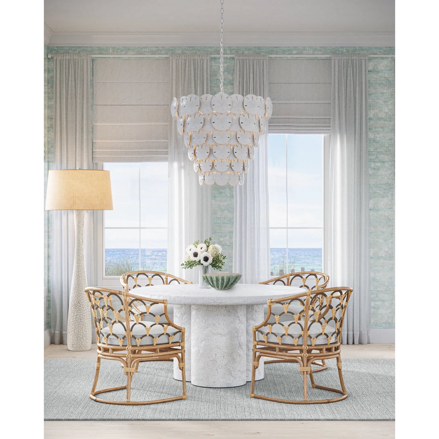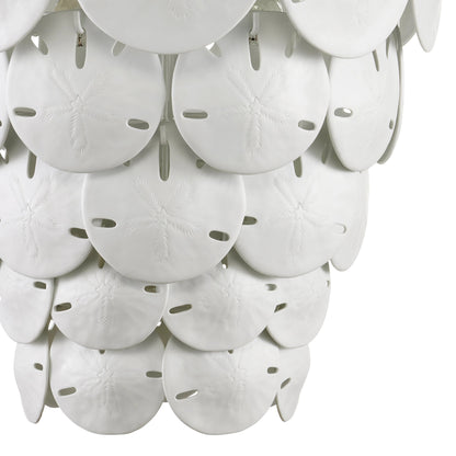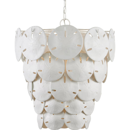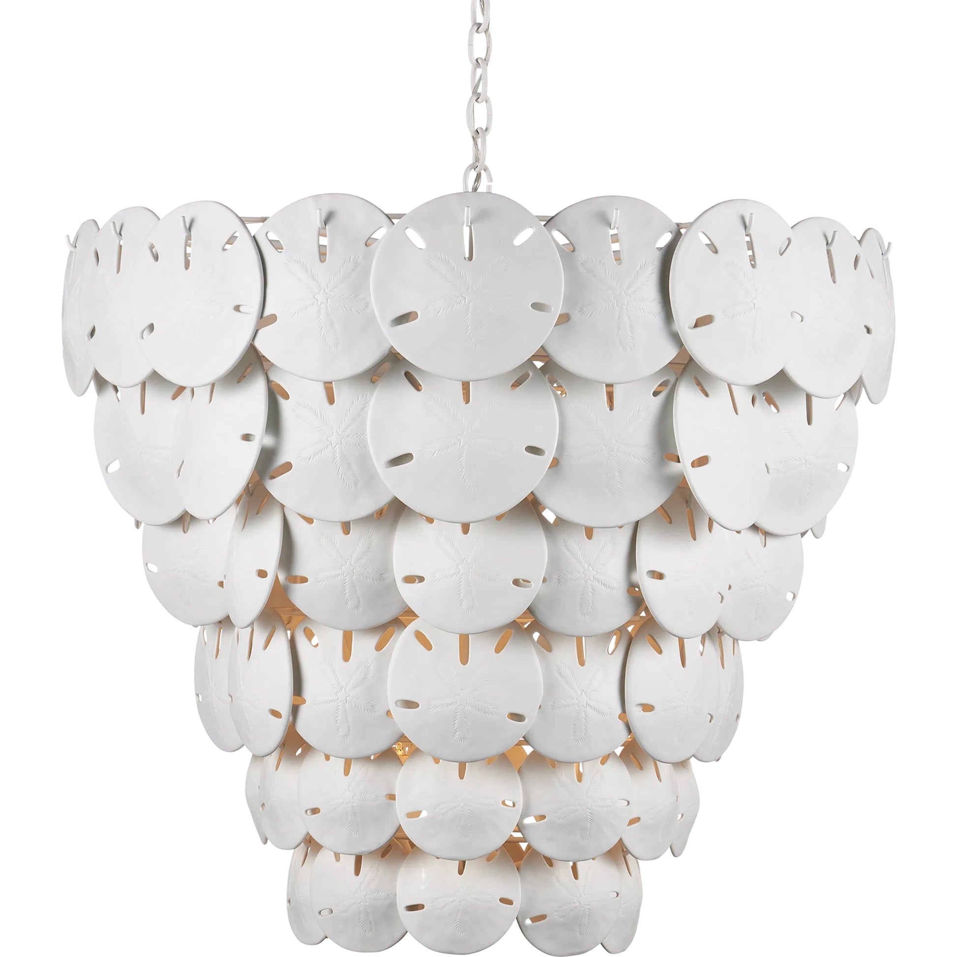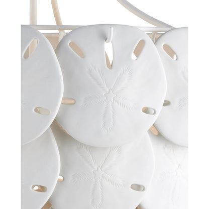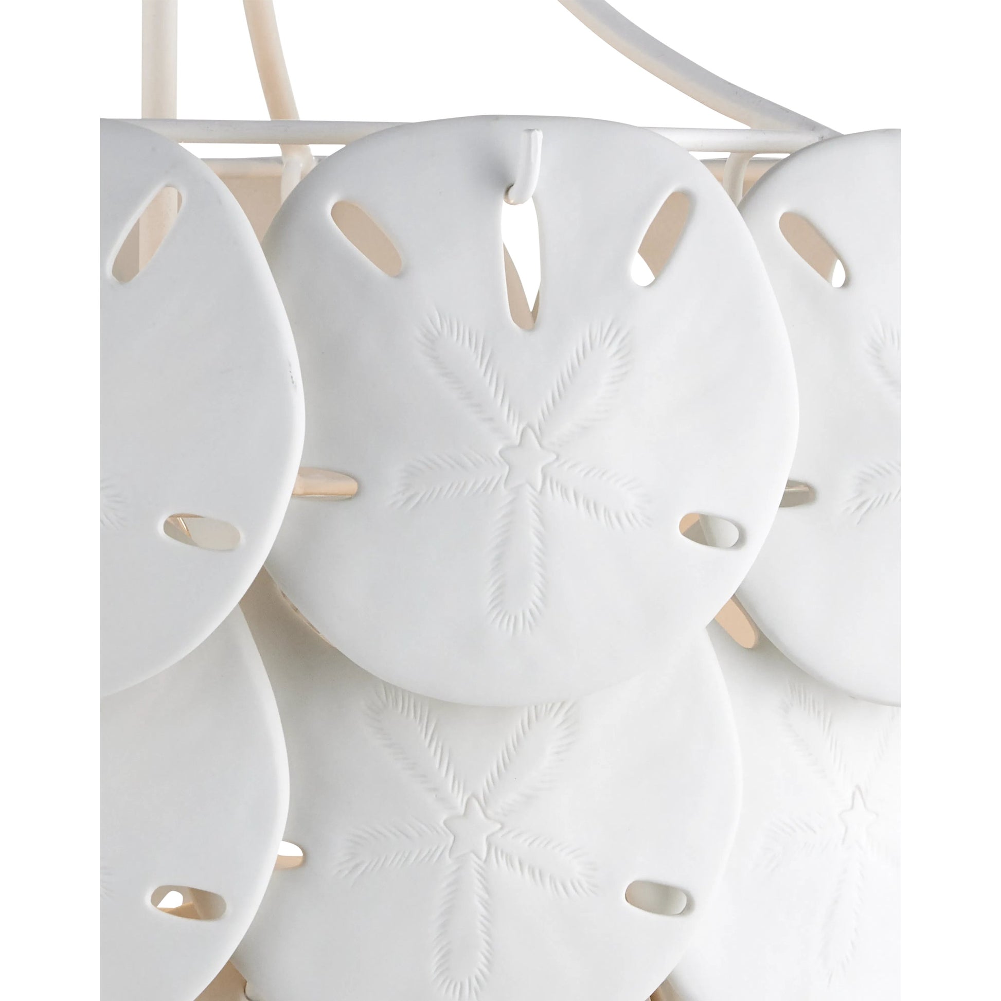 Marjorie Skouras designed the Tulum Extra Large Chandelier, which was inspired by the tropical beauty of the Yucatan Peninsula where she lives. This is an elegantly delicate design, as the sand dollars are cast in semi-translucent bone china and they make a pretty sound when a breeze ruffles them. There are three sizes of removable sand dollars on this design, making it easy to clean. The sugar white finish on the hardware complements the pale discs on this nature-inspired chandelier, making it apropos for rooms overlooking the ocean. Adjustable from 36.5" to 104.5" with use of included chain/rod kit/cable. If your space calls for a longer drop, additional chain/rods/cable is available for purchase.