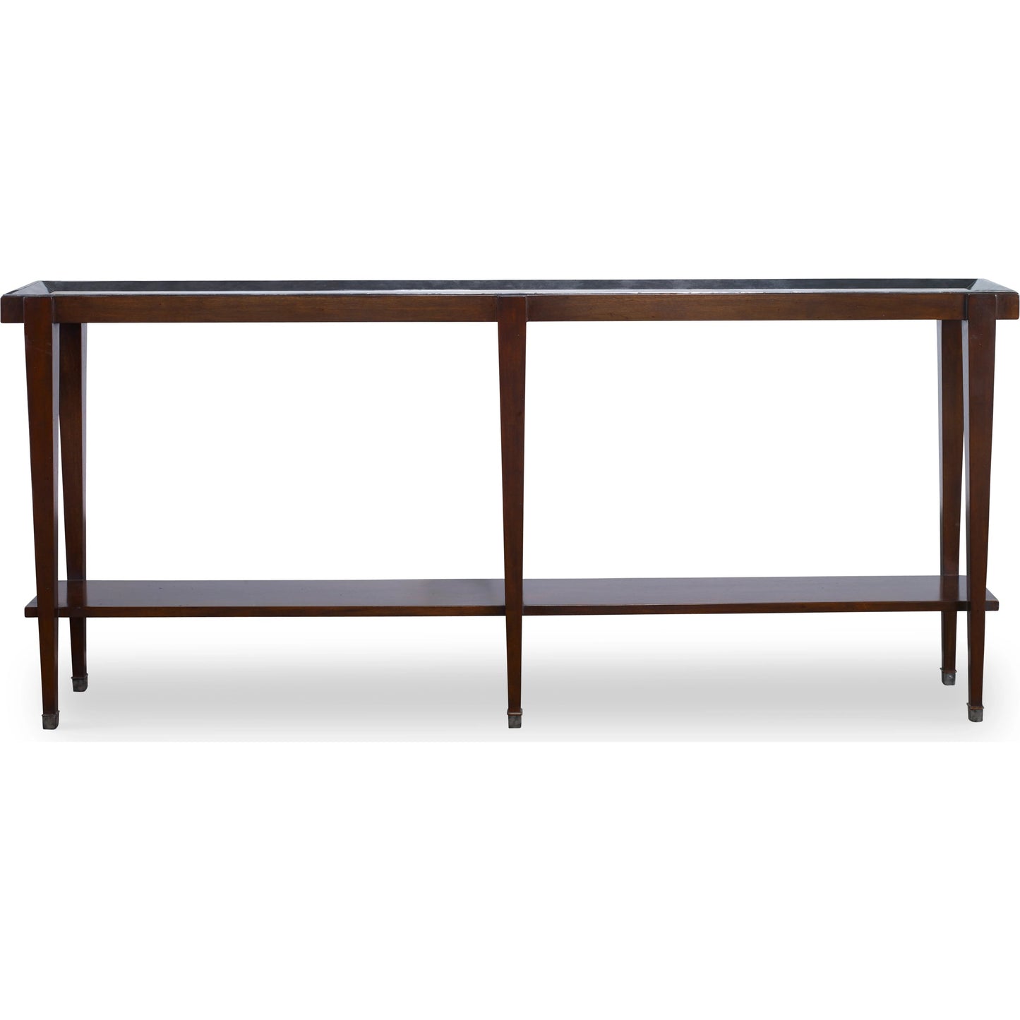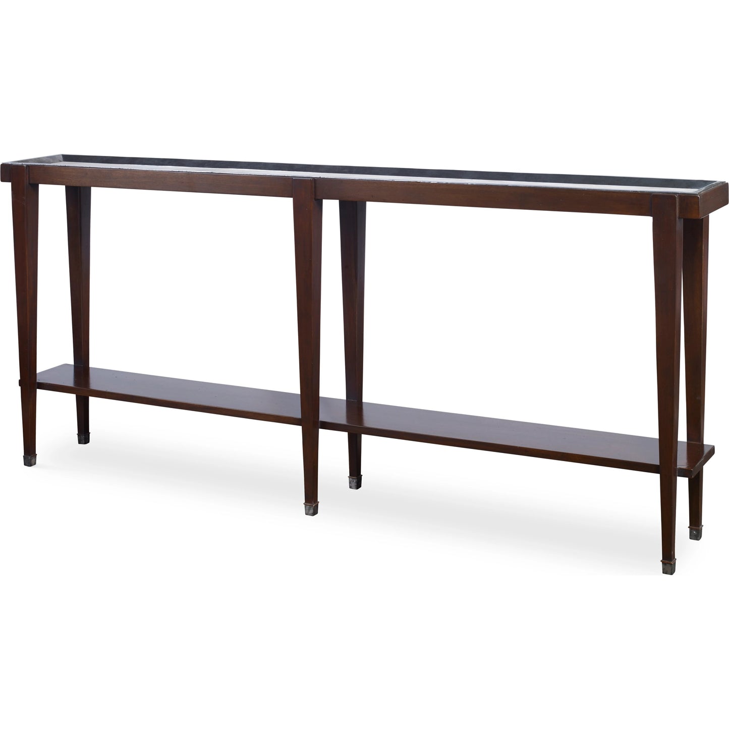 Dark Walnut Finished Winthrop Console Table with Dessert Tan Scagliola Top, Metal Accents.