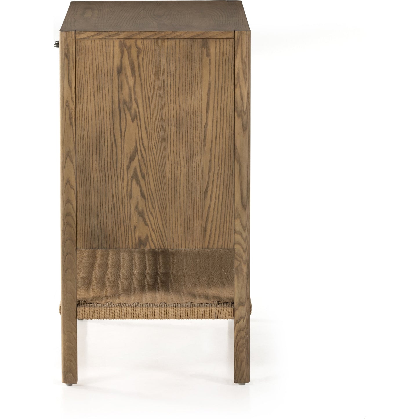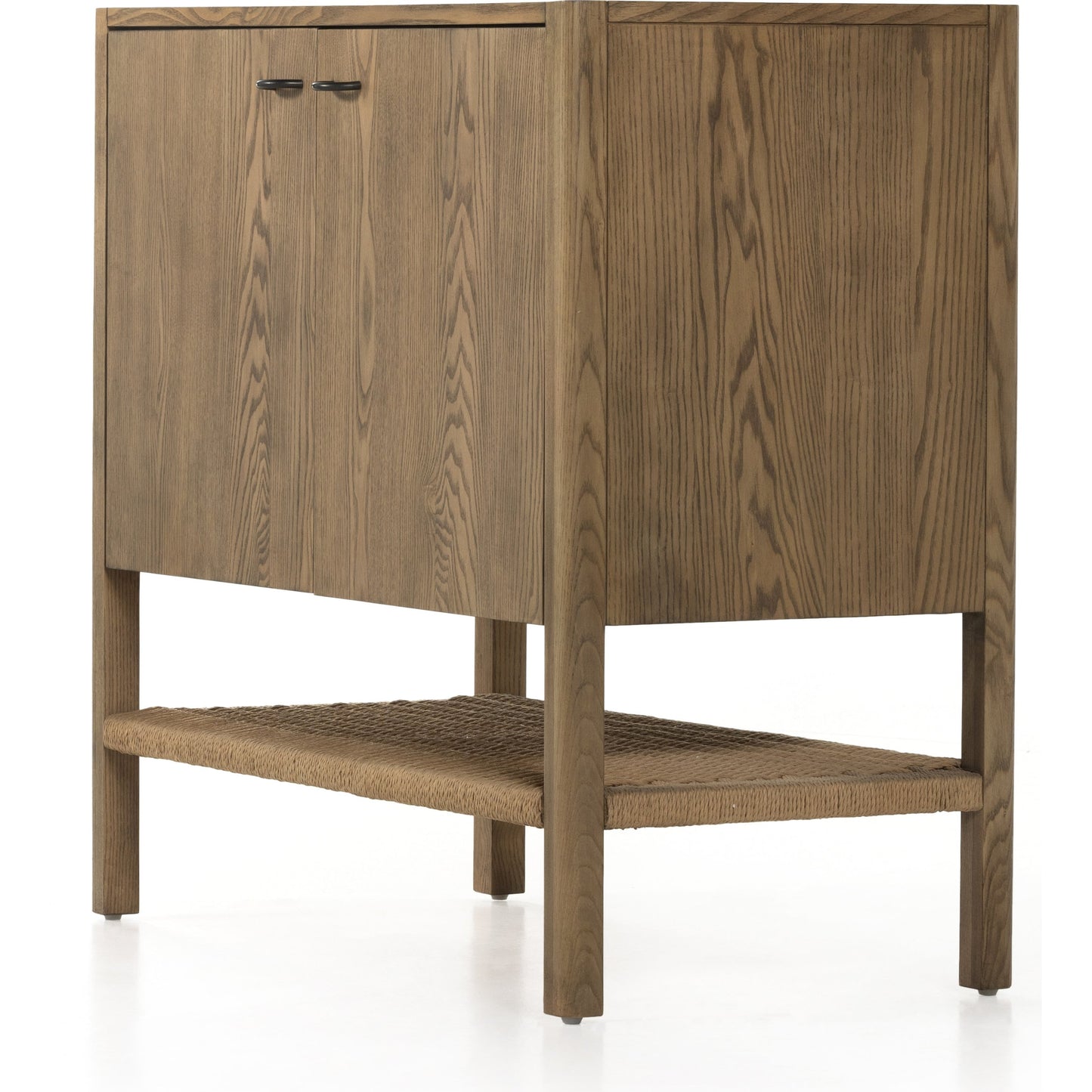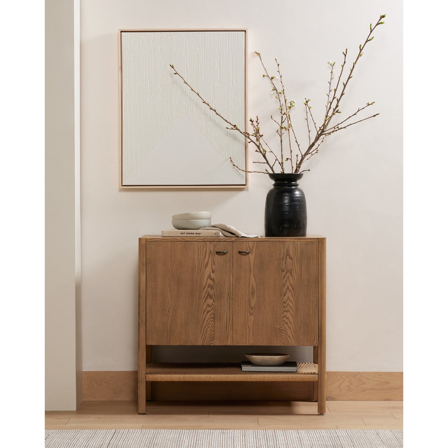 Solid, light-finished ash forms streamlined cabinetry, cleverly sized for smaller spaces. Lower open shelving made from natural paper cord adds a textural finishing touch.