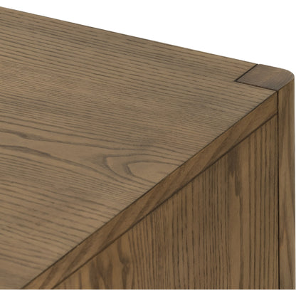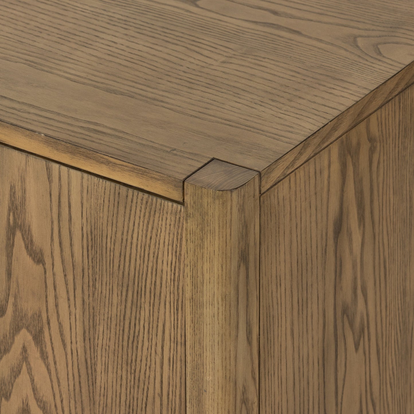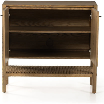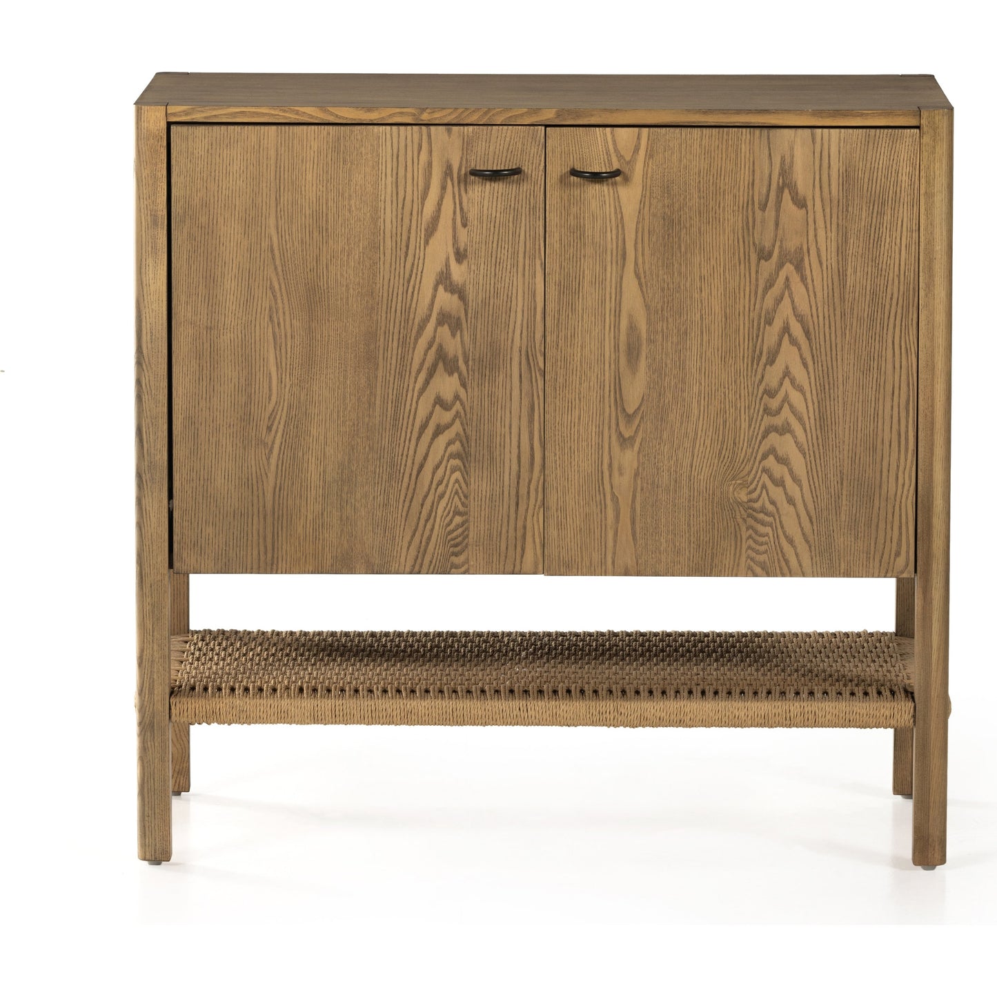 Solid, light-finished ash forms streamlined cabinetry, cleverly sized for smaller spaces. Lower open shelving made from natural paper cord adds a textural finishing touch.